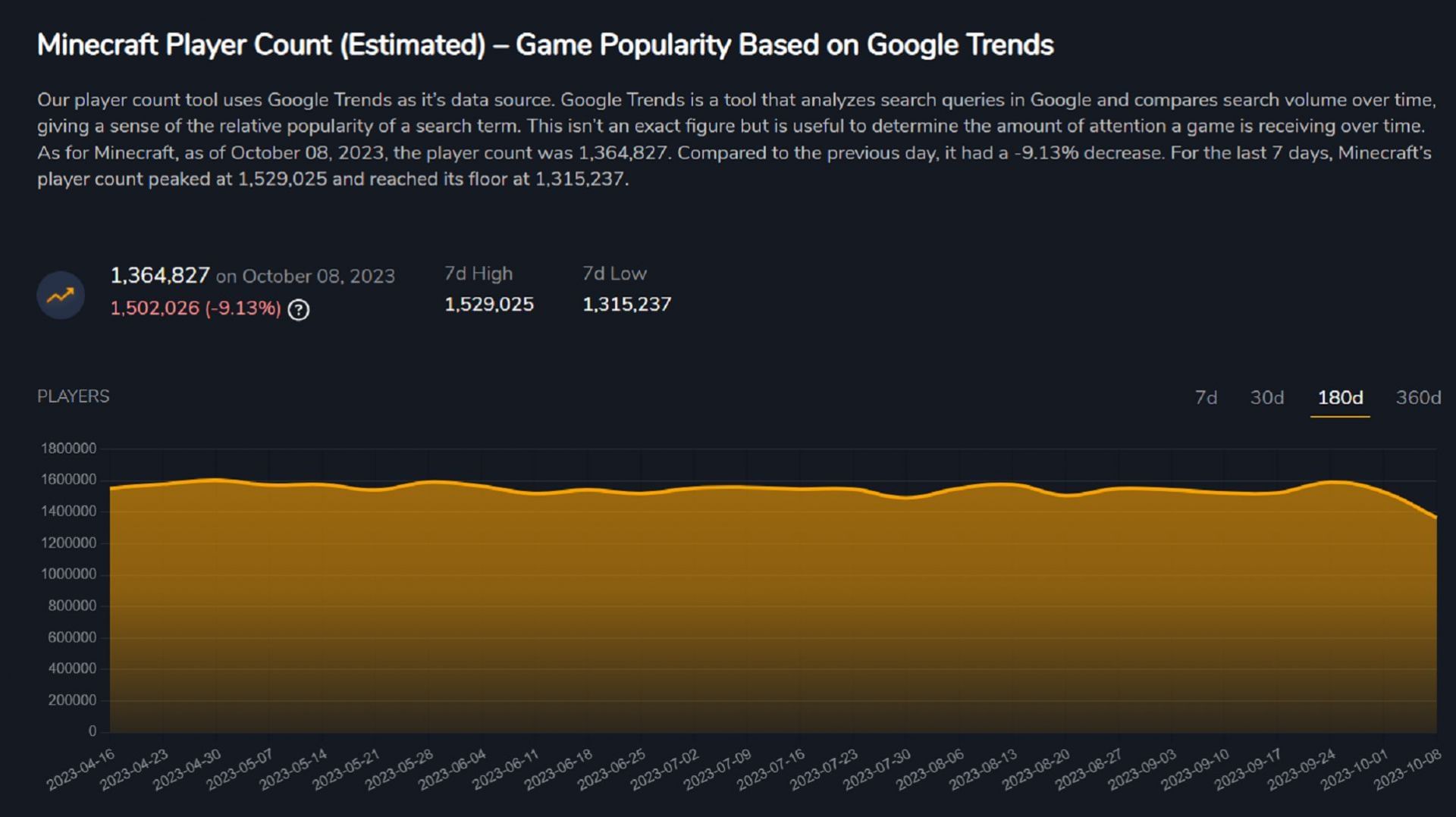 According to the metrics tracking site Activeplayer.io, Minecraft saw over 174 million active players in the last 30 days. August and September 2023 also sported over 168 million active players based on the same tracker. Concurrent players in a single day have also held steady at around 10-11 million for the past several months.