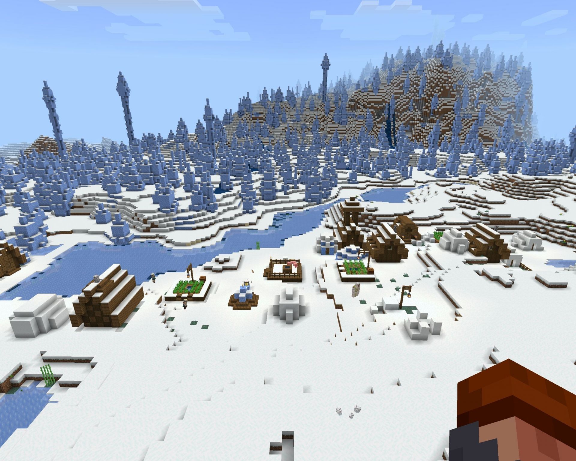 Almost everything players might need to jumpstart their Minecraft world can be found nearby. Numerous villages should provide players with food, loot, and basement igloos from which players can get golden apples and potions.