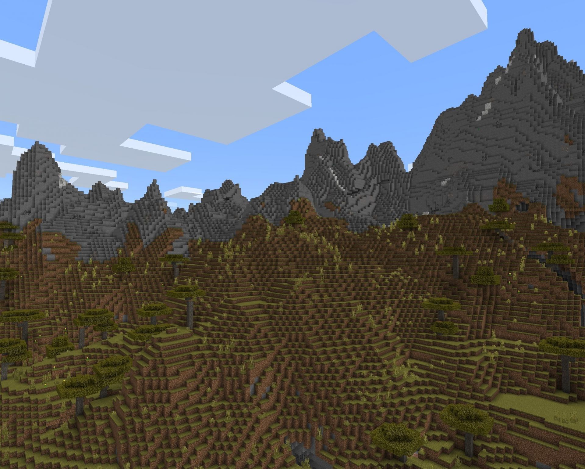 This seed spawns players on the edge of a large savannah mountain range. There is a large jungle biome to the south, with a small jungle biome to the northwest. A badlands biome to the southwest and more jungles to the northeast.