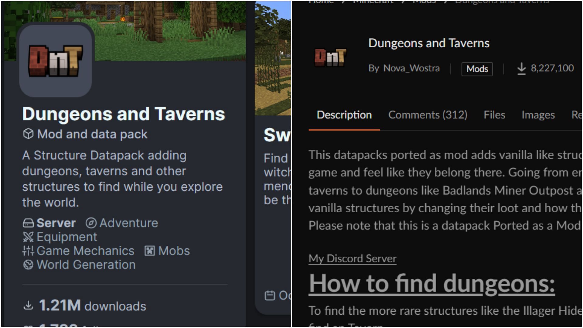 This datapack brings vanilla-like structures that look and feel like they belong in the game. Structures like fire watch towers and taverns and Dungeons like badland minder outposts and illager hideouts are added with this datapack. Dungeons and Taverns not only add new kinds of structures but also overhaul some existing structures by changing their loot and how they generate in a world.