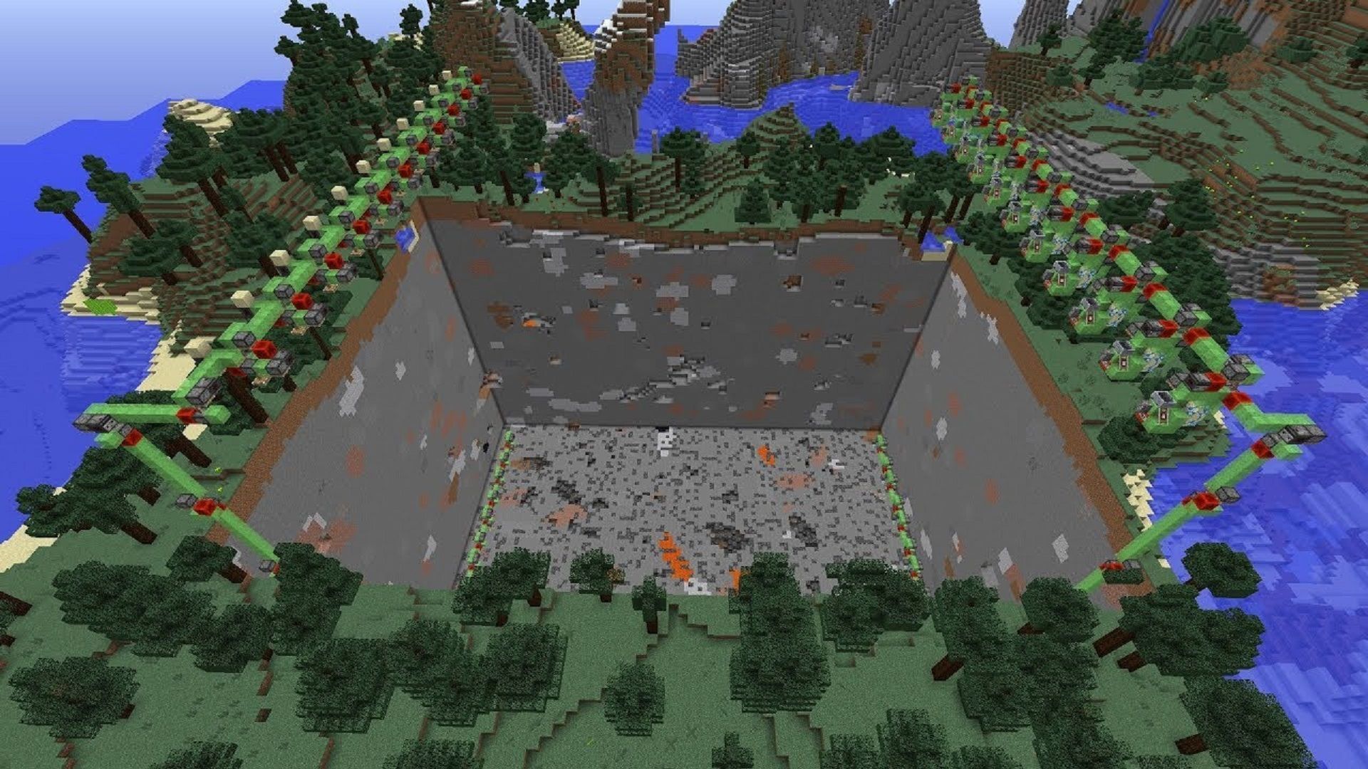 Popularized by Minecraft YouTuber ilmango, who is a masterful redstone engineer, World Eaters are an effective way to clear land without the use of editing tools or Creative Mode. They are constructed in a crane-like shape, with three arms reaching out over the earth.