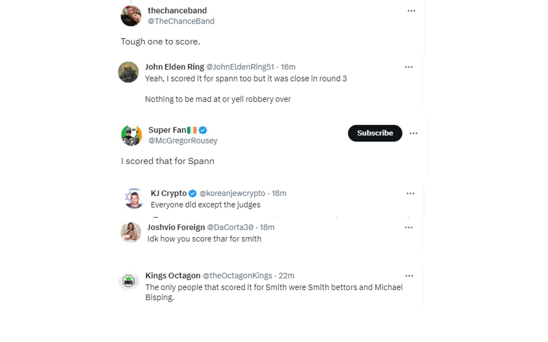 The decision has sparked a debate among MMA fans. While most fans believe Spann should have gotten the nod, some argue Smith did enough to steal the third round, and therefore the fight.