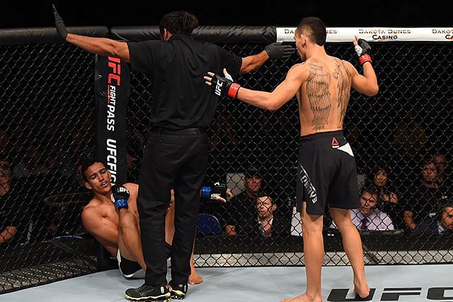 The two men exchanged some early strikes before Oliveira attempted a takedown, and when Holloway was able to defend, the Brazilian attempted to pull guard. Holloway was having none of that and stood back up – only for Oliveira to collapse to his back, clutching his neck. Referee Herb Dean was then forced to stop the fight, awarding a strange and anticlimactic TKO to Holloway.