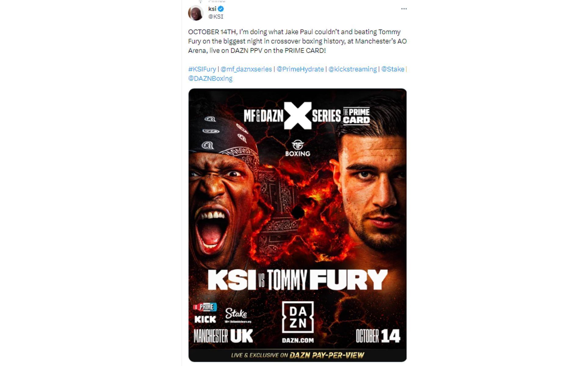 After months of speculation, KSI vs. Tommy Fury was made official as the two will be headlining the upcoming PRIME card, which takes place at the AO Arena in Machester on October 14.