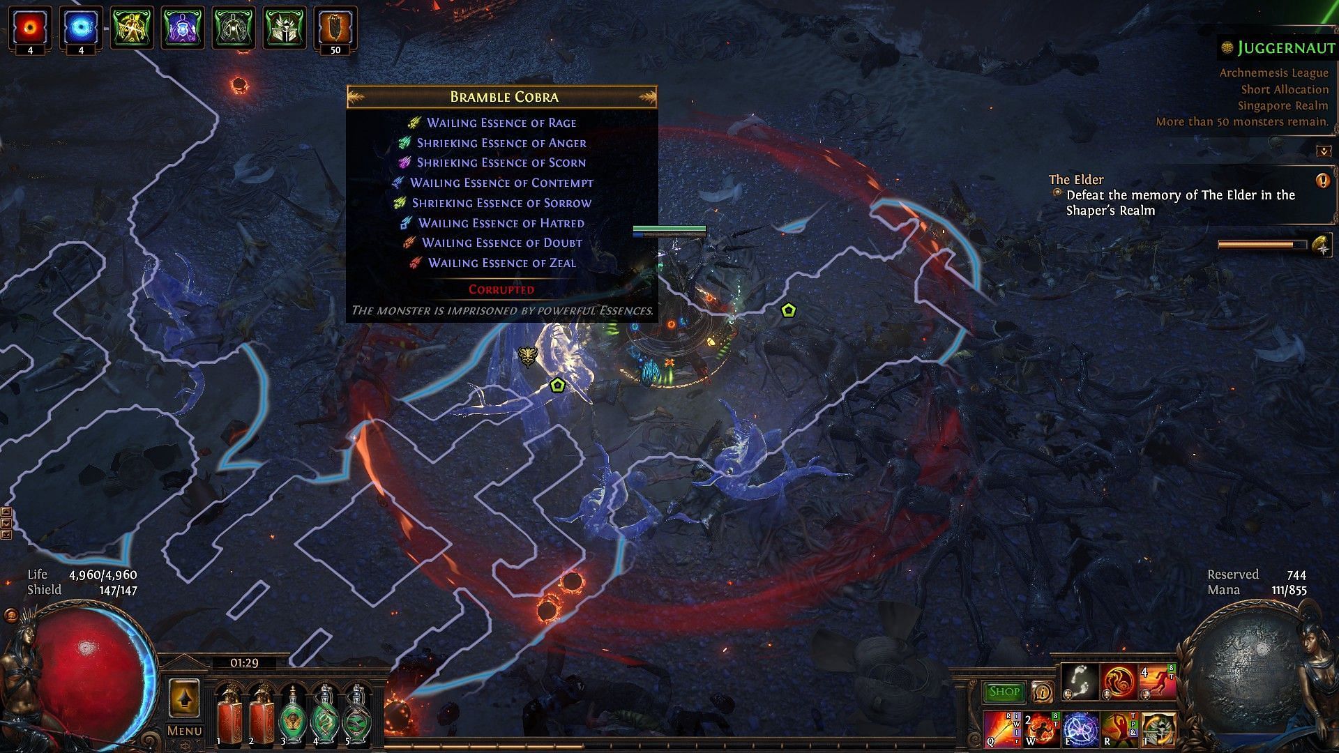 Essences are a cornerstone of crafting in PoE, regardless of the ongoing challenge league and its trade economy. These are obtained from killing monsters entombed in crystalline prisons, where random enemies are imbued with various effects and can easily kill unsuspecting players. Moreover, essences can be applied or “slammed” onto existing rare gear to guarantee a specific affix and randomize others.