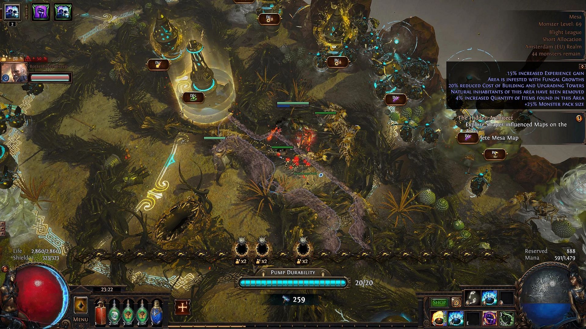 Blight is essentially ‘tower defense meets APRG’ rolled into a single league mechanic. Since its launch in 2019, Blight has been one of the most consistent mid to high-end loot generators, with little to no entry cost. Upon encountering a Blight tower and its disturbingly cheerful companion Sister Cassia, players are instructed to build modifiable defensive towers along mycelial lanes. Clearing the incoming enemies showers players with loot while additional chests, each containing a specific type of loot, spawn for each defeated portal.