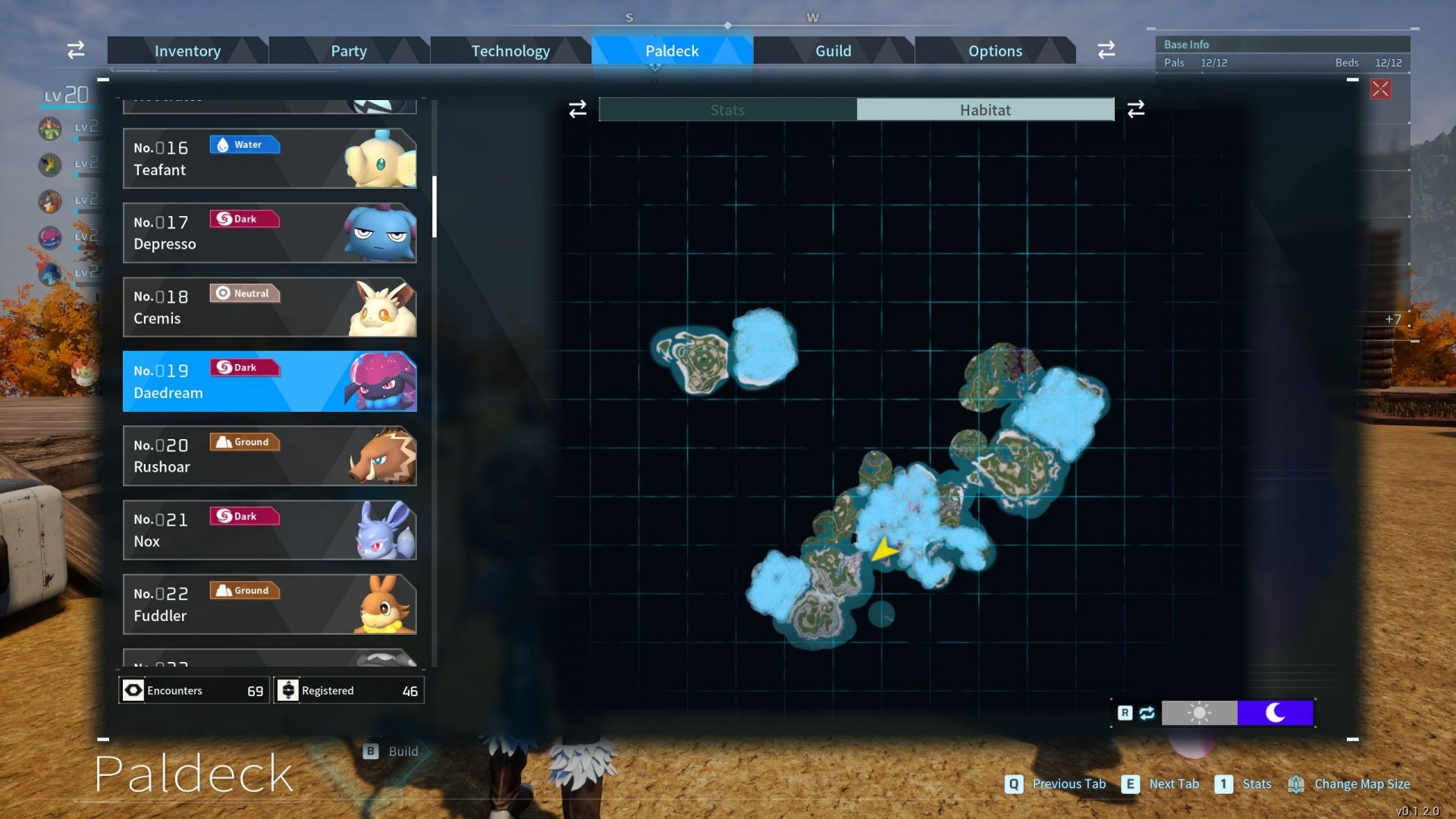 The Paldex keeps track of all encountered and caught Pals, as well as complete details, including their spawn locations. In this aspect, the UI and interface could be better. For one, since night-exclusive Pals do not spawn in the day, Palworld does not display their locations by default; you must instead press the Night tab in the corner of your screen to see the location map, which is an odd design choice.