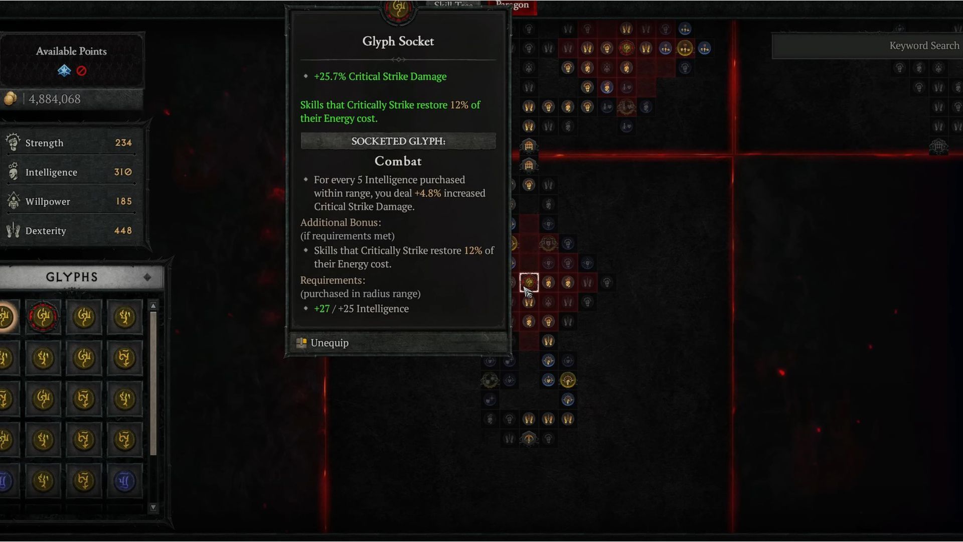 The paragon board is an important part of Diablo 4 game mechanics and it can only be unlocked once you cross level 50 with your character. Start with the Infusion glyph for this build, and make sure you increase your dexterity points as you progress further, unlocking all the necessary nodes adjacent to the glyph. Below are some of the glyph nodes that must be unlocked for this specific build: