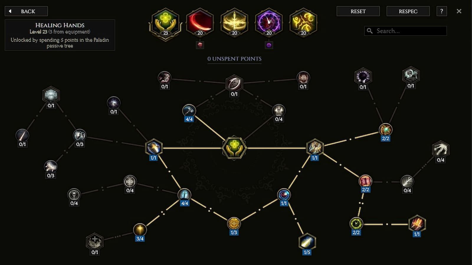 Start putting points in the Paladin tree as soon as you unlock the Mastery, which should allow you to get Healing Hands at level 20+. This is also when the third specialization slot unlocks, where you can place this skill and immediately put four points in the Cleric's Hammer node.