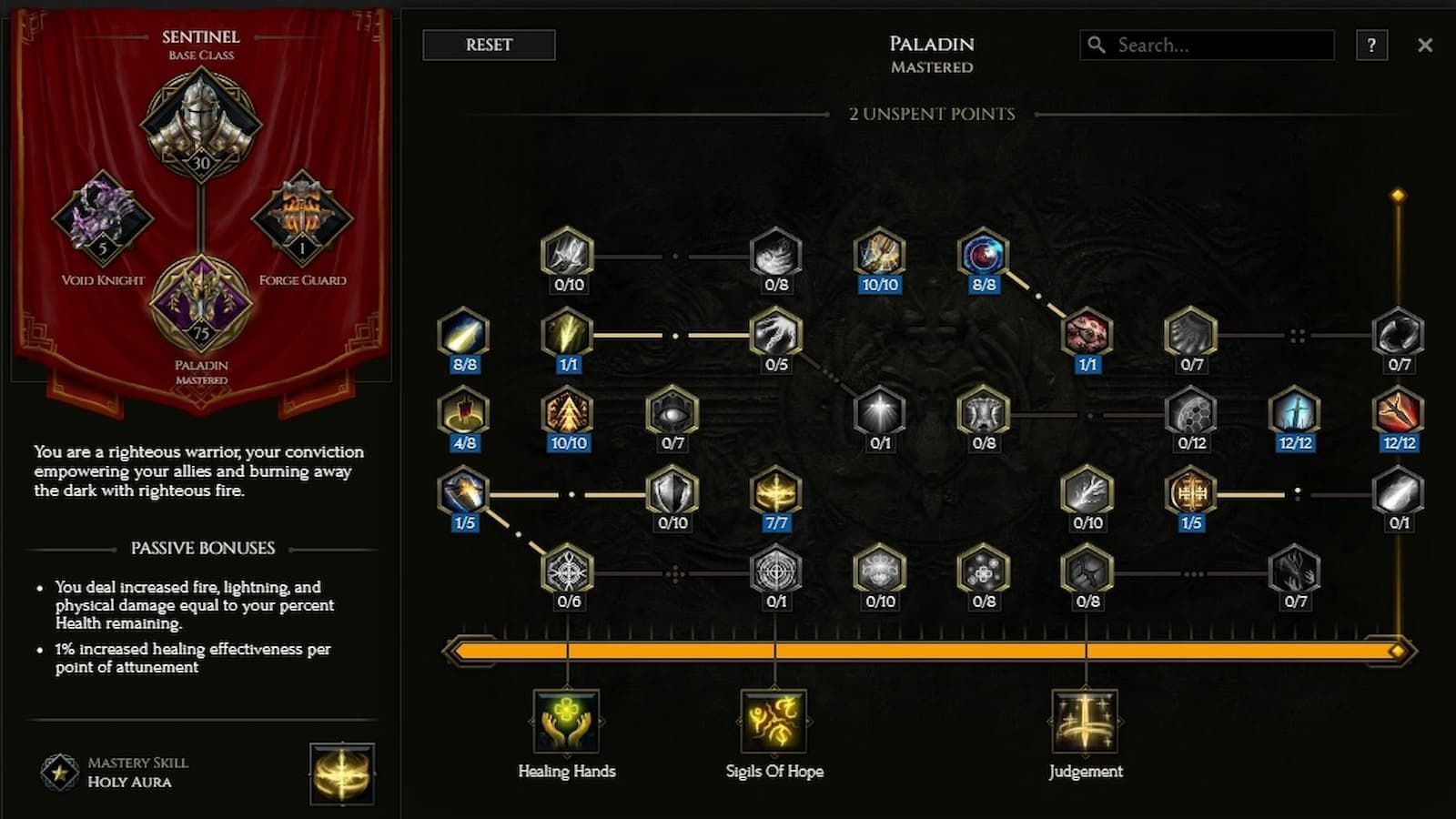 This Last Epoch Paladin build comes fully online at about level 50, and you need to be in the level 80-90 range to tick all of the nodes shown here.