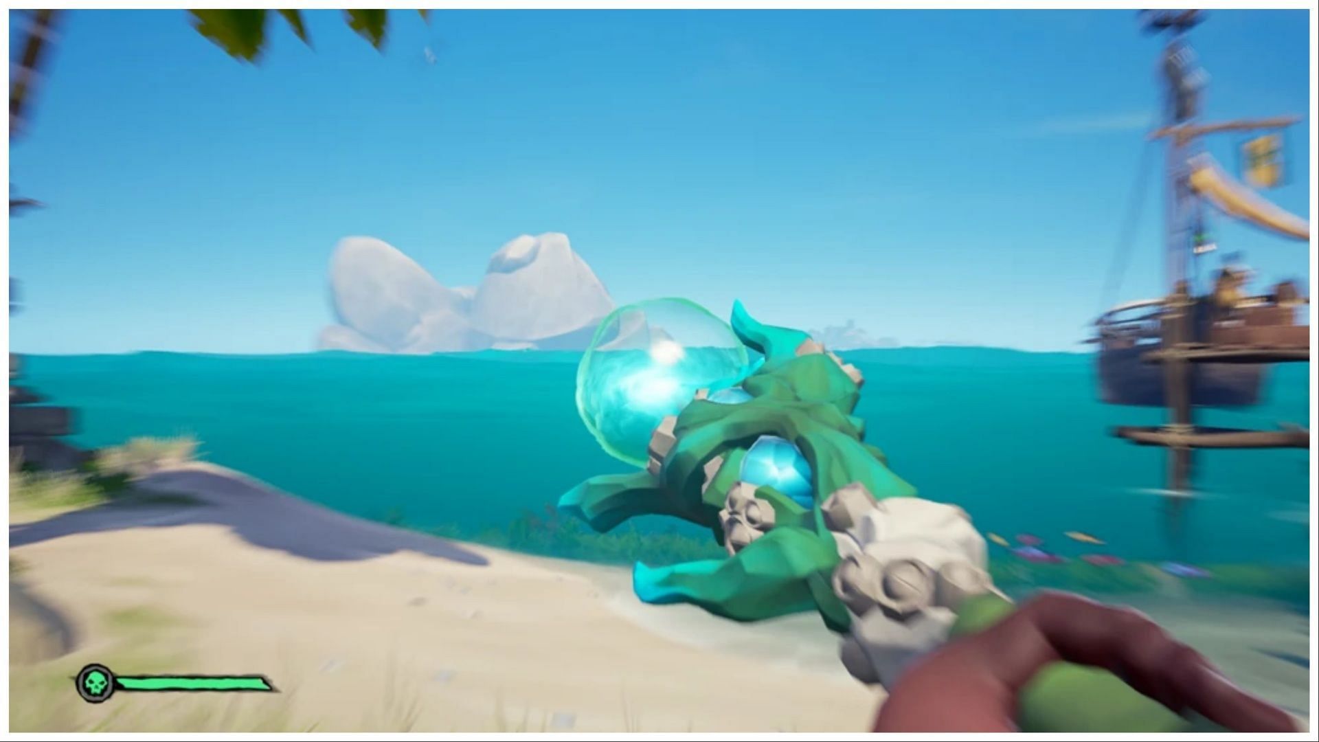 While it might not be the top choice for PvP battles, the Trident of Dark Tides offers a range of shot options, making it one of Sea of Thieves' most versatile weapons. It shoots small, medium, and large charged bubbles that can damage as well as knock back enemies. The longer you charge it, the bigger its bubbles get.