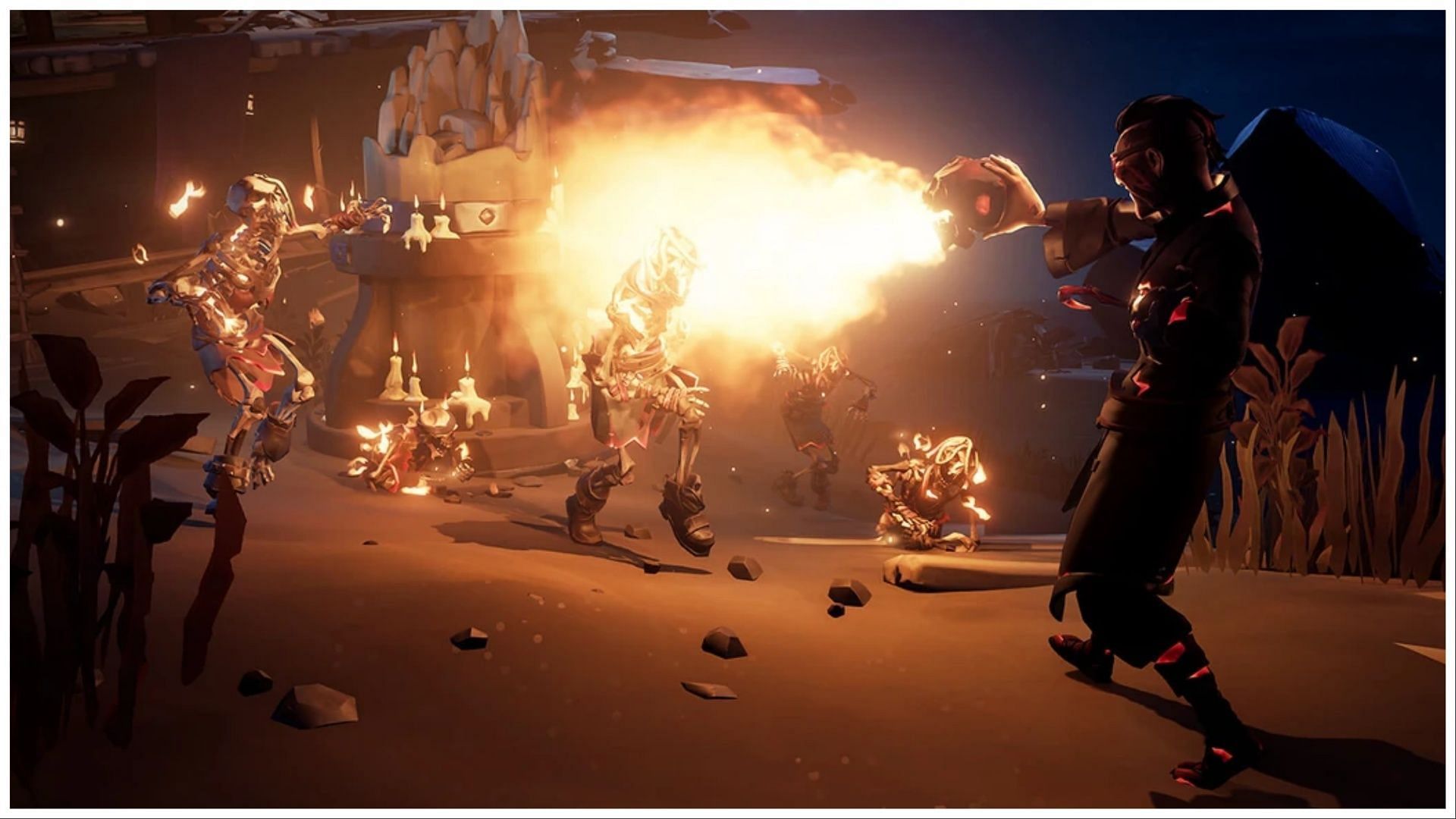 The Ashen Winds Skull is a flamethrower. Players can really stir up some chaos with this item, carrying the fiery might of an Ashen Lord after you defeat it. It's handy for setting things ablaze during naval battles, but it's not an instant damage dealer like some other weapons on this list. Instead, it slowly chips away at their health over time.