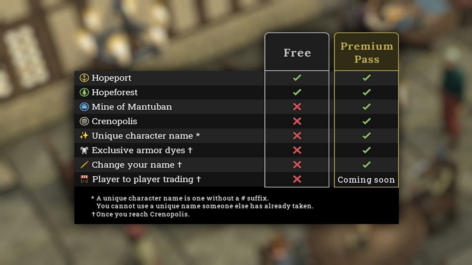 Additionally, this unlocks the ability to change your name (when you have an active monthly sub) and use unique character armor dyes. While the game is relatively new, those who want to stick to the endgame will also need the Premium Pass just for the player-to-player trading alone. At the time of writing, p2p trading is only available to subscribed players.