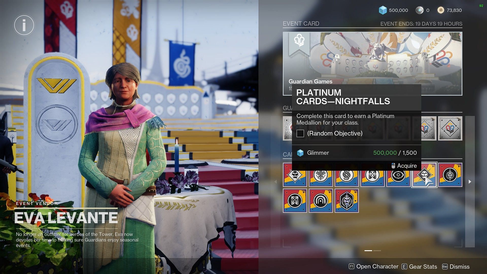 Upon launching the game, you will be met with Eva Levante at the Tower, along with a special quest called "Best in Class". Your first task is to complete this quest, as this is an introduction to the rest of the event. Its objectives include equipping a Guardian Games Class Item, provided by Eva Levante, and finishing either a PvP Supremacy match or an event playlist activity.