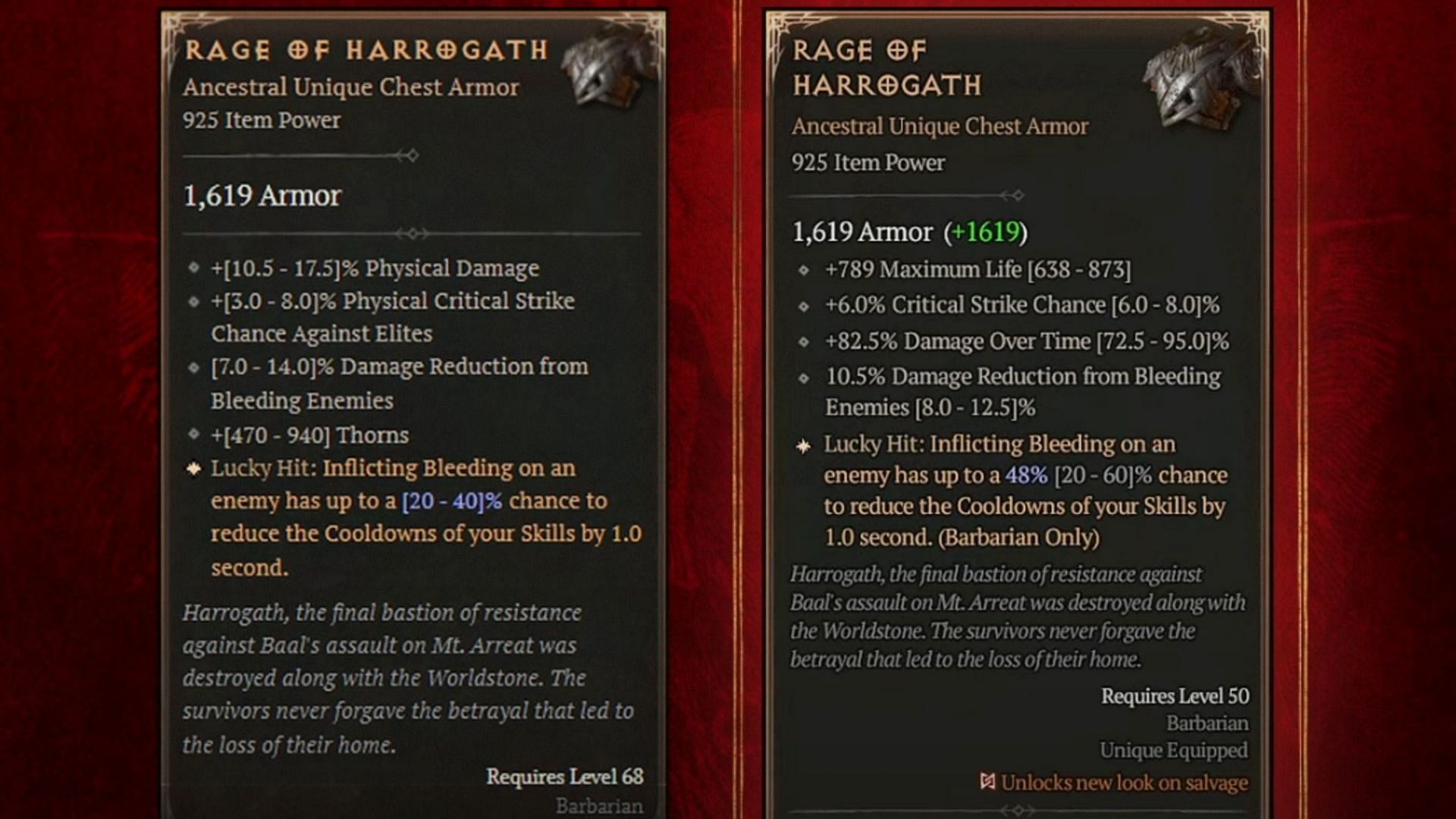 The Rage of Harrogath is one of the most popular picks for Barbarians in Diablo 4. It's been a strong pick for nearly any build but is going to be an even stronger one in Season 5. This item can grant you Cooldown Reduction, which is good for any build. It can drop from level 85+ monsters with a better chance from Beasts, Vampire, Werewolves, and Wildlife. The Ubers Lord Zir and Girgoire also drop it.