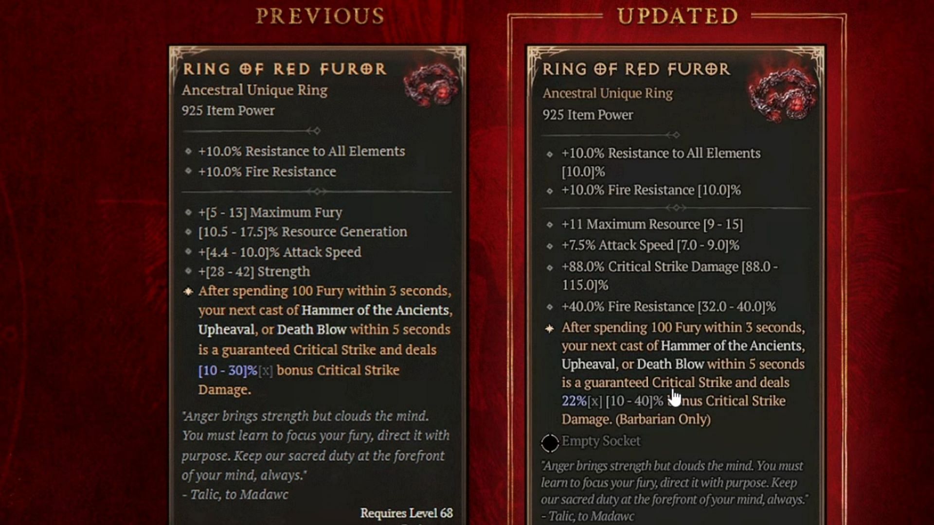 This item has been updated for Season 5, buffing some stats and changing others entirely. The biggest changes are foregoing Strength for Crit damage, removing Resource Generation, and adding Attack Speed. Its main effect guarantees a critical strike after using Hammer of the Ancients, Upheaval, or Death Blow within 5 seconds. This effect has had its Crit Damage cap increased to 40% in Season 5.