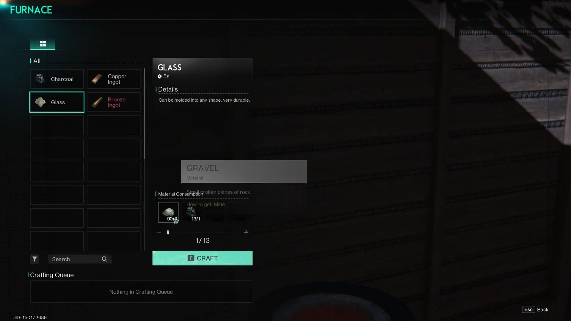 Once your Furnace is set up, you can see the Glass recipe there. To craft Glass in the Furnace, you will need two items: Gravel and Charcoal. Gravel is the easiest resource to get in the game. You can collect it by mining any rock on the map; this can be done using any pickaxe.