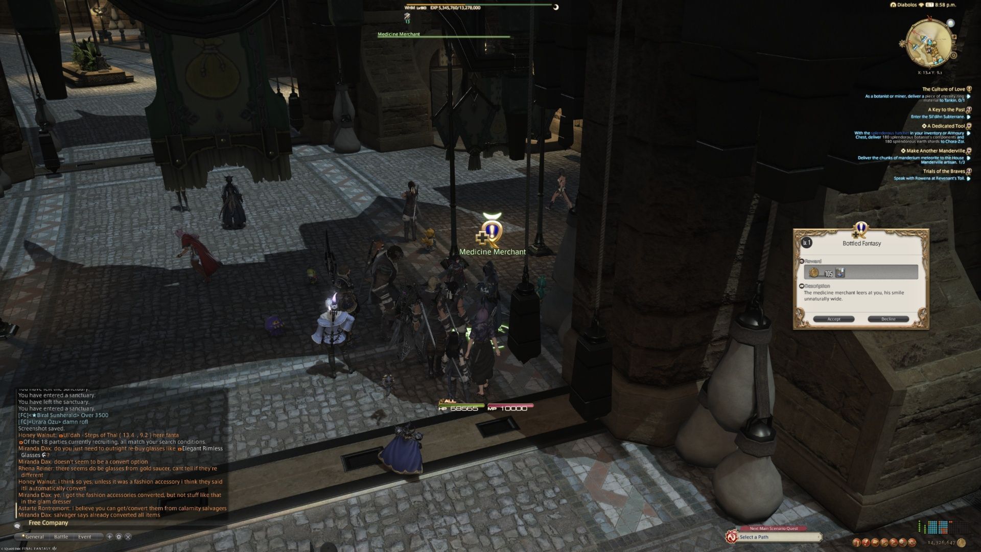 It’s a level 17 Main Story Quest, but it won’t take you very long to get to it. Once you’ve done this, and have access to Ul’dah, travel to the dusty, desert city and head to coordinates (13.4, 9.2) in The Steps of Thal. Speak to the NPC Medicine Merchant, and claim the quest Bottled Fantasy.