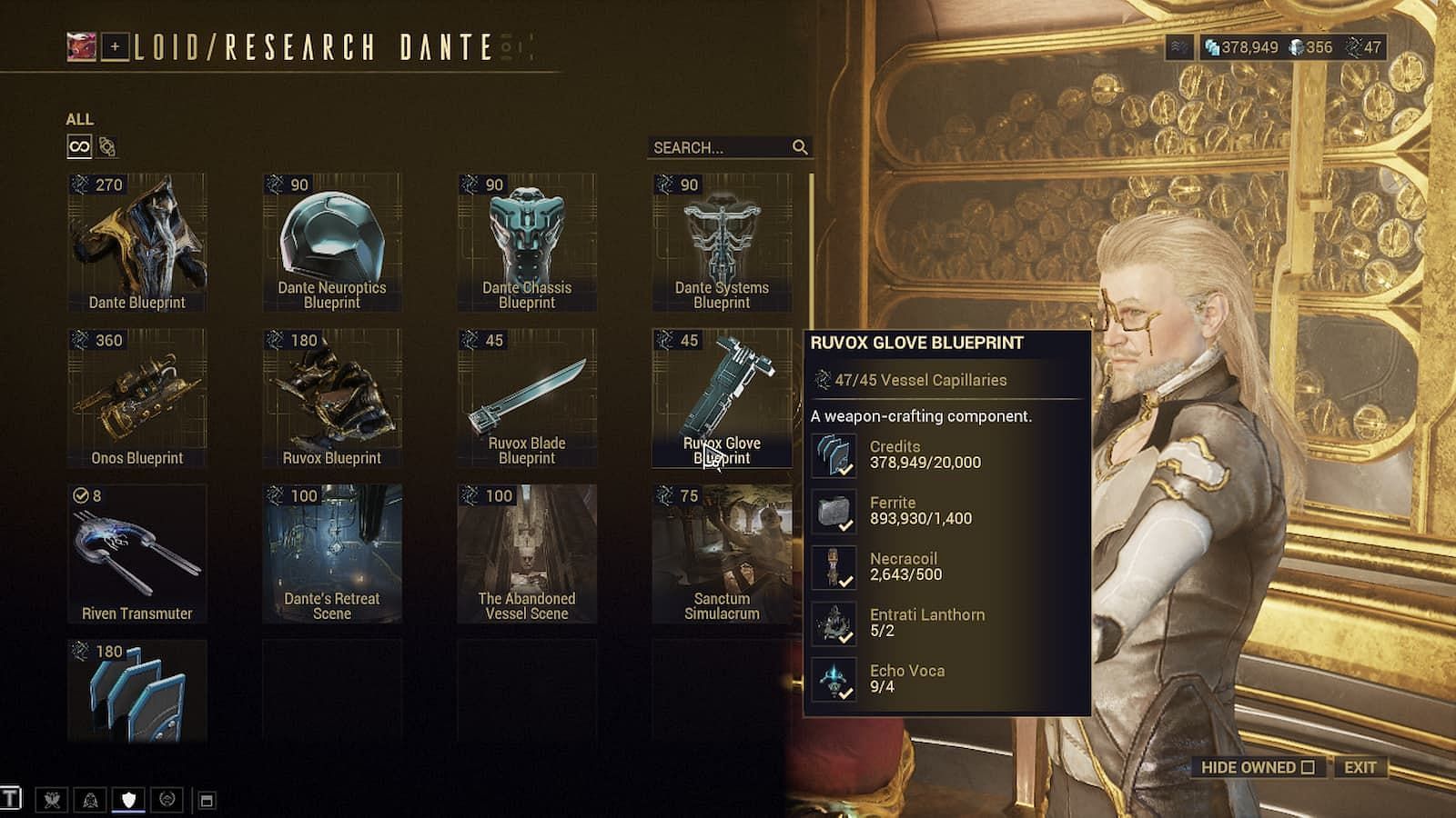 - To craft Ruvox Glove, you need: 20000 Credits, 1400 Ferrite, 500 Necracoil, 2 Entrati Lanthorn, 4 Echo Voca.