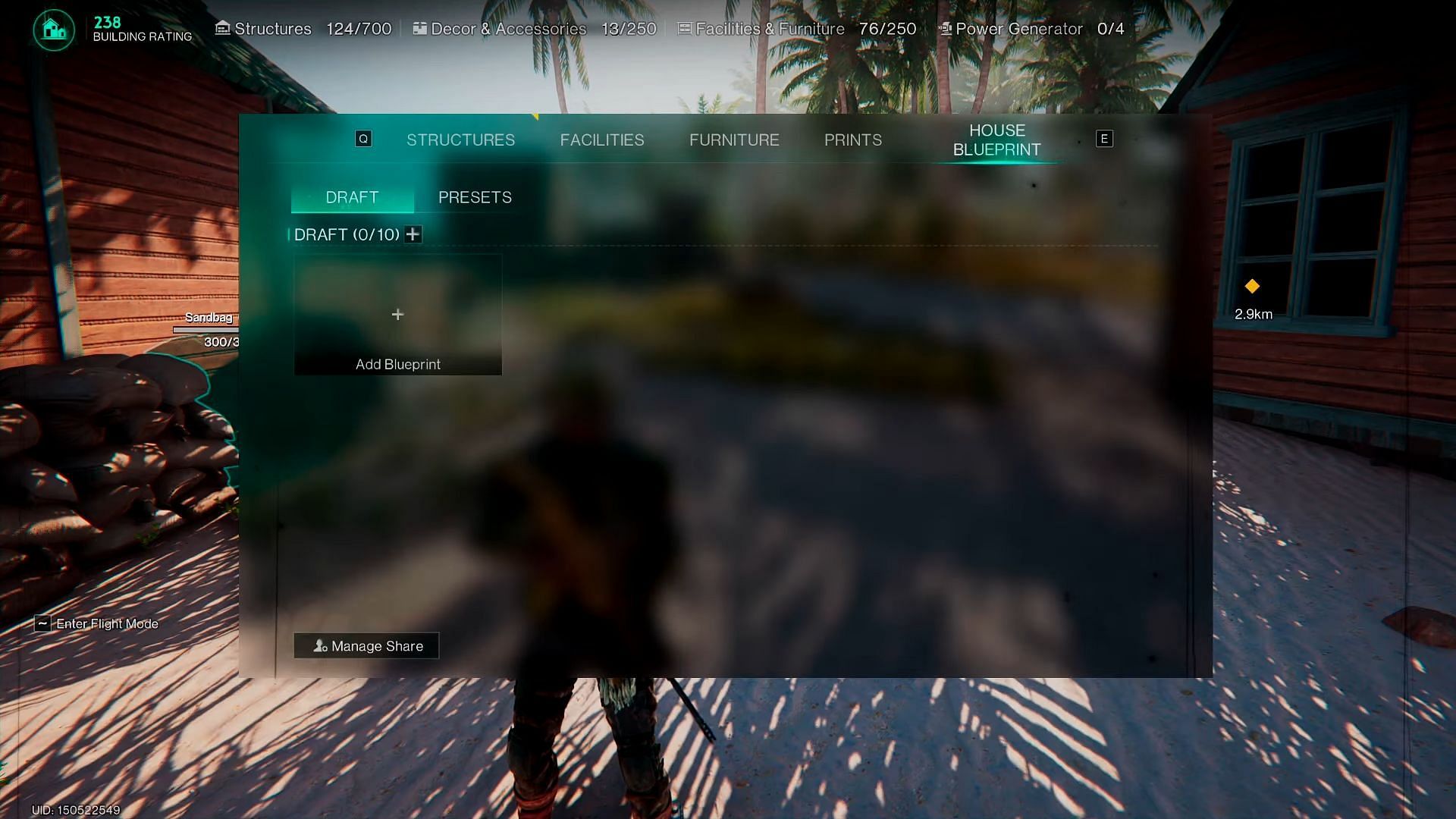 - In the build menu, look for the House Blueprint section in the top right corner. You will also see a Presets option, which contains various pre-made structures you can build if you have the necessary materials. However, if you only want to save your base blueprint, you can ignore it.