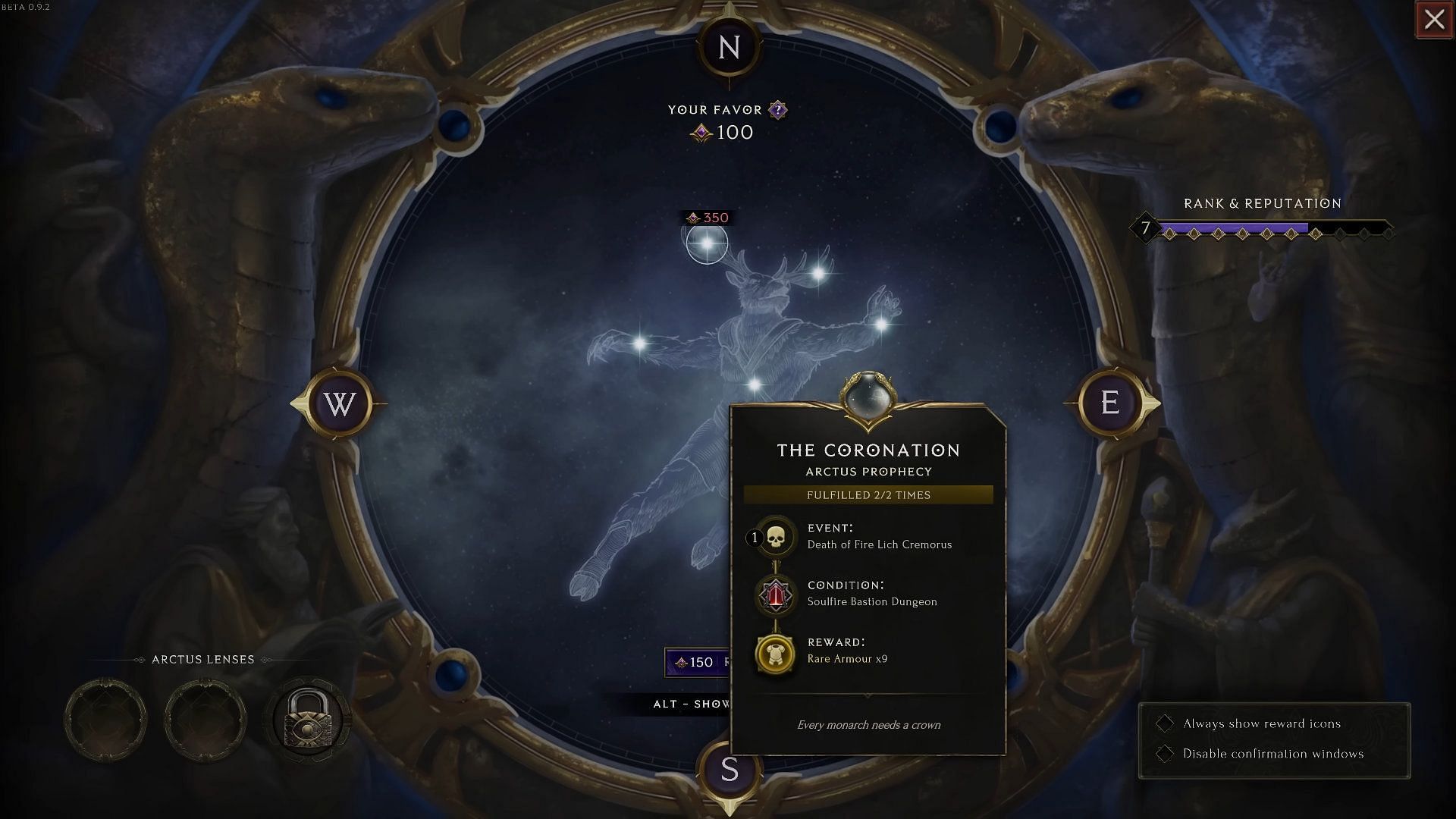 Visit the Observatory, where four telescopes point in four directions (North: Arctus, East: Eos, West: Dysis, and South: Mesembria) to acquire prophesies. Select the telescope according to the kind of thing you want: Accessories, Weapons, Armor, and Idols and Crafting Supplies.