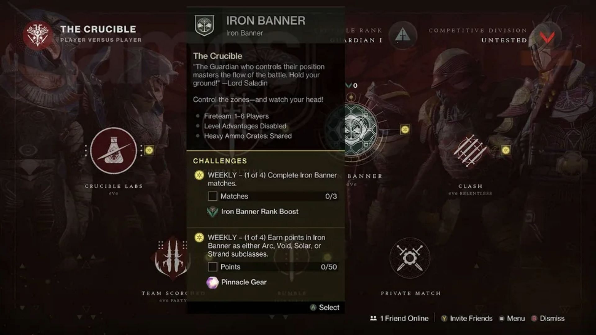 Iron Banner features exclusive rewards like Iron Banner-themed weapons, an Iron Banner-themed armor set, and general Crucible rewards. This Destiny 2 PvP activity also comes with various challenges that will provide pinnacle rewards and reputation rank with Lord Saladin to redeem certain rewards from him. These rewards include various Iron Banner Weapons, Ascendant Shards, prime engrams, and exotic engrams.