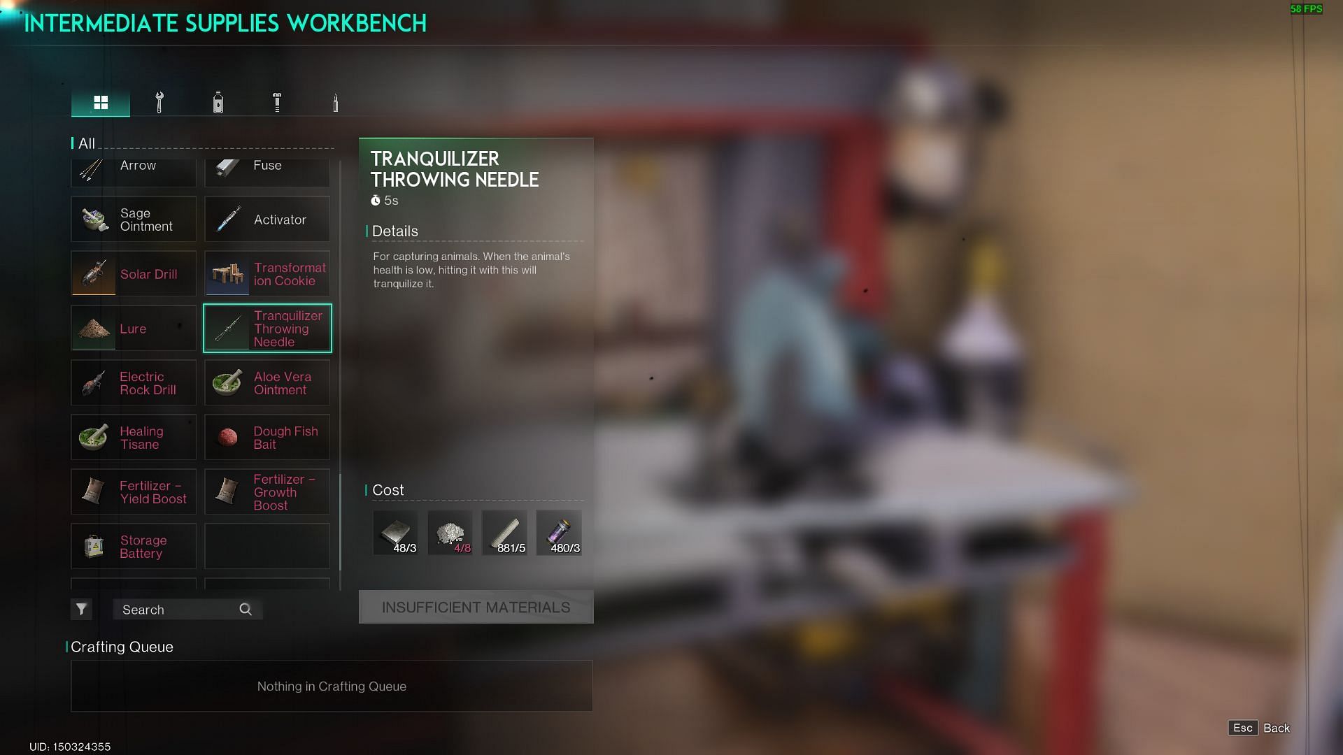 The Animal Capture unlock in the Memetics tree enables you to craft Tranquilizer Throwing Needles at an Intermediate or Advanced Supplies Workbench. To craft this needle, you will need:
