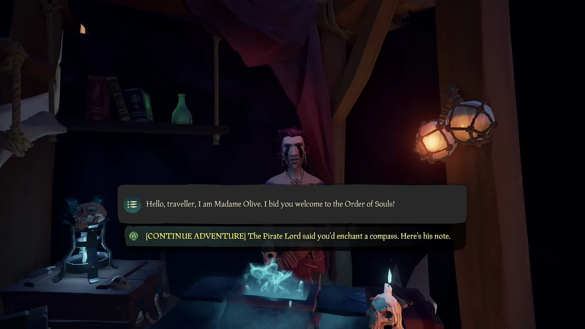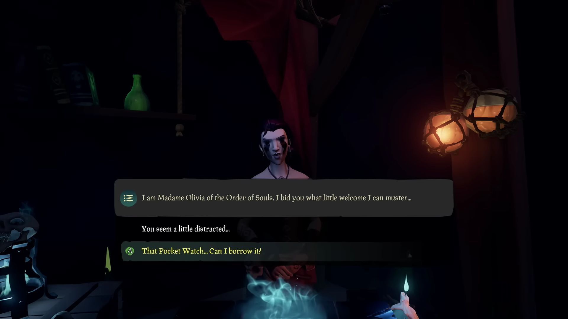 Traverse to the Plunder Outpost located at coordinates J-18 in Sea of Thieves. Once you arrive at the Outpost, head to the Order of Souls tent. Upon asking for the Pocket Watch from Madame Olivia in the tent, she will deny your request as she does not want to be parted from the precious watch.