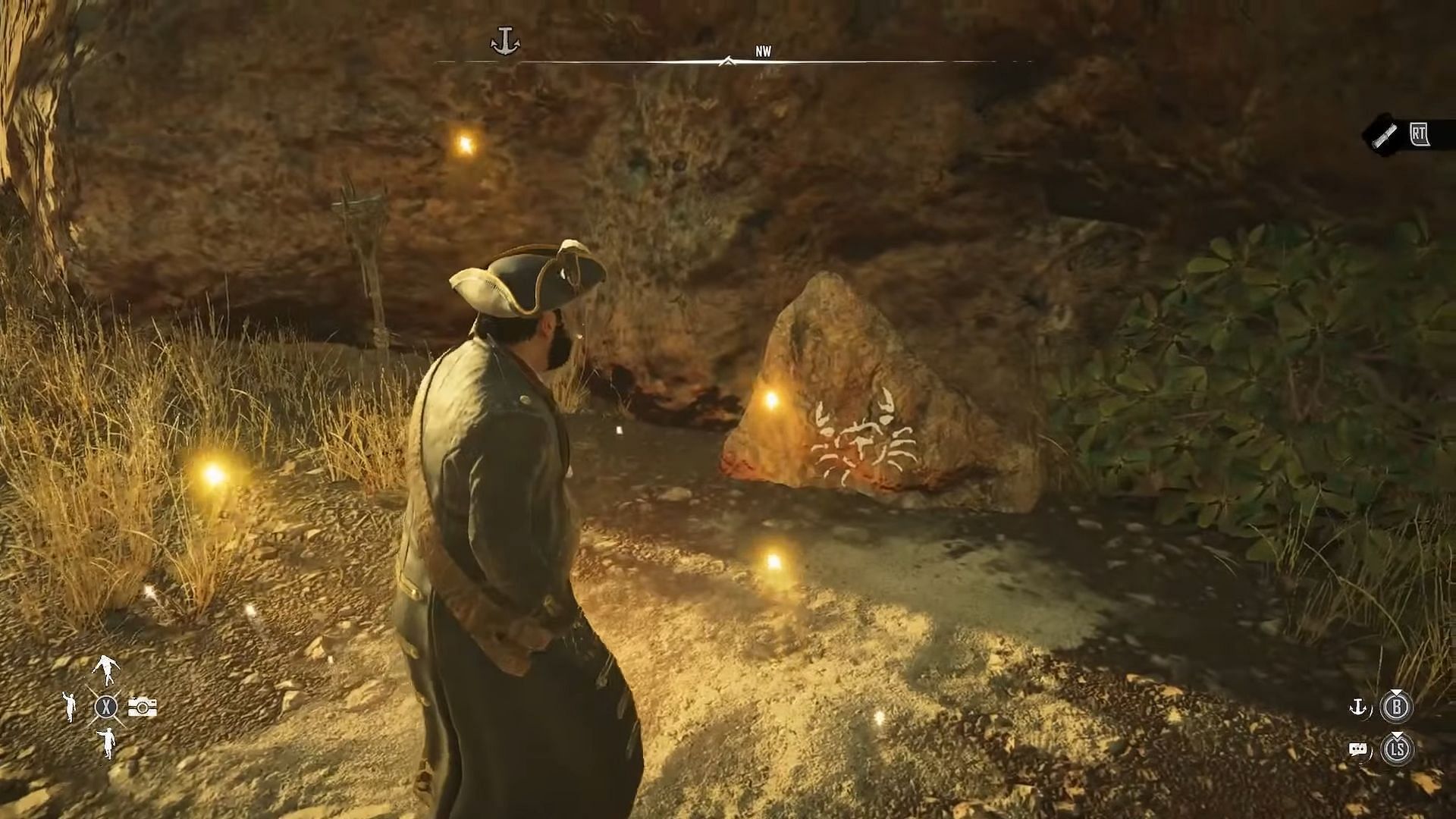 Refer to the map provided by Scurlock to locate the Agent’s Stash. The stash can be found next to a Pirate Bonfire within the Sunken Goldmine in Skull and Bones, indicated by a series of markings on a rock.