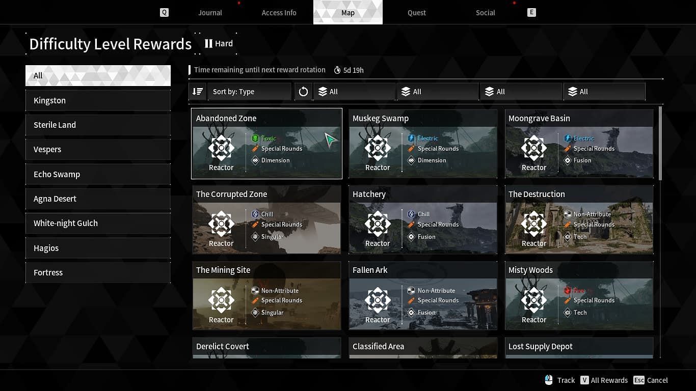The First Descendant's Hard Mode opens up the path to easily farming Ultimate Reactors and other Components. Go to the overworld map (G) and press "F" to open the rewards menu, which will list the Reactor combination dropping on individual open-world areas.