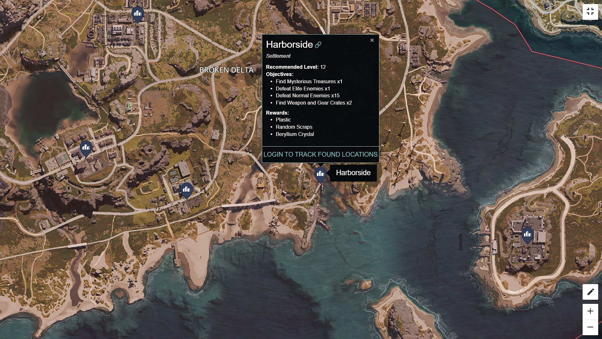 Located in the southern region of Broken Delta, this settlement is right next to the shore, which makes it a good source of Polluted Water. You can also loot some Beryllium Crystals and plastic from the crates that spawn in this region. The recommended level for this location is 12, but you can come here even at lower levels.