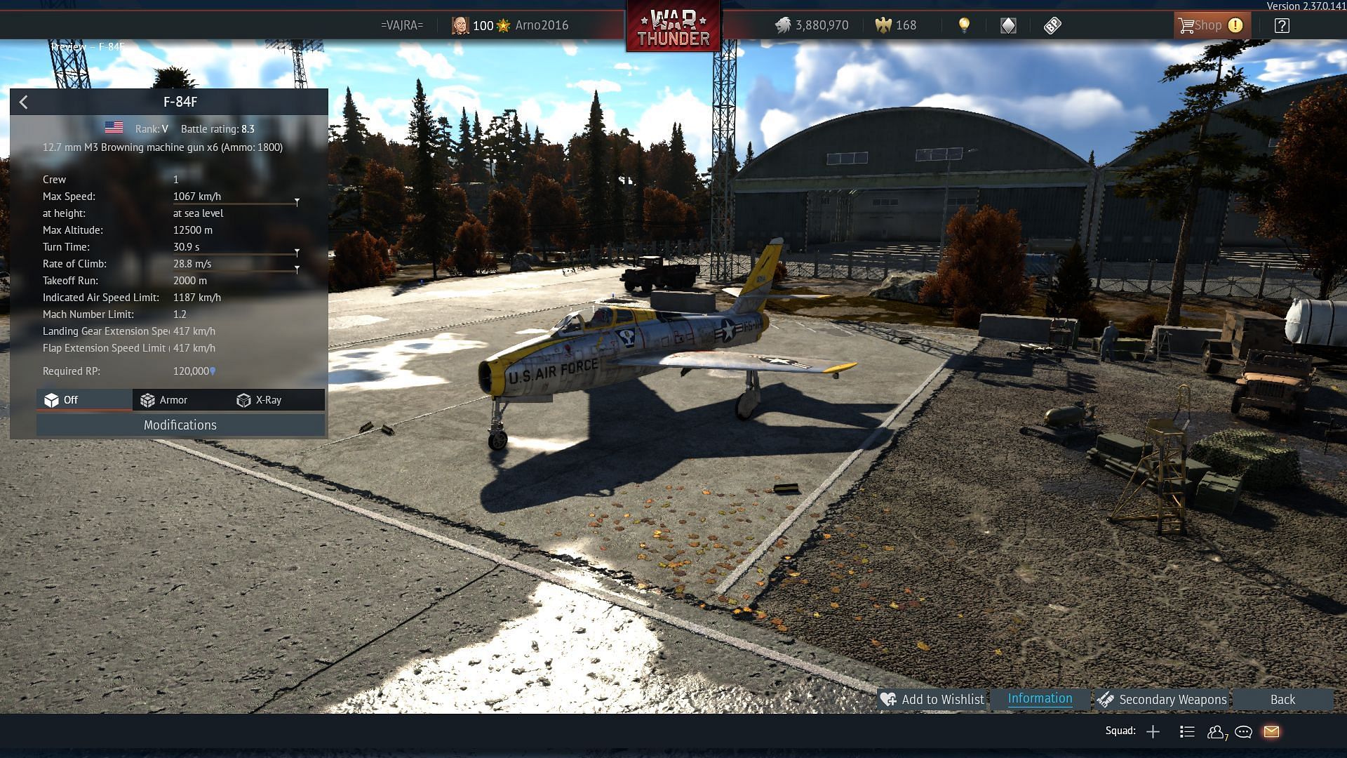 The F-84F can be found in the American, German, French, and Italian tech trees. It is a regular researchable vehicle in the strike aircraft line of each tech tree.