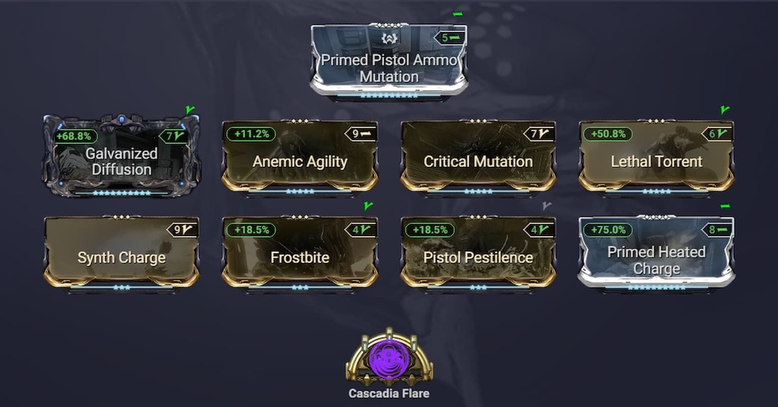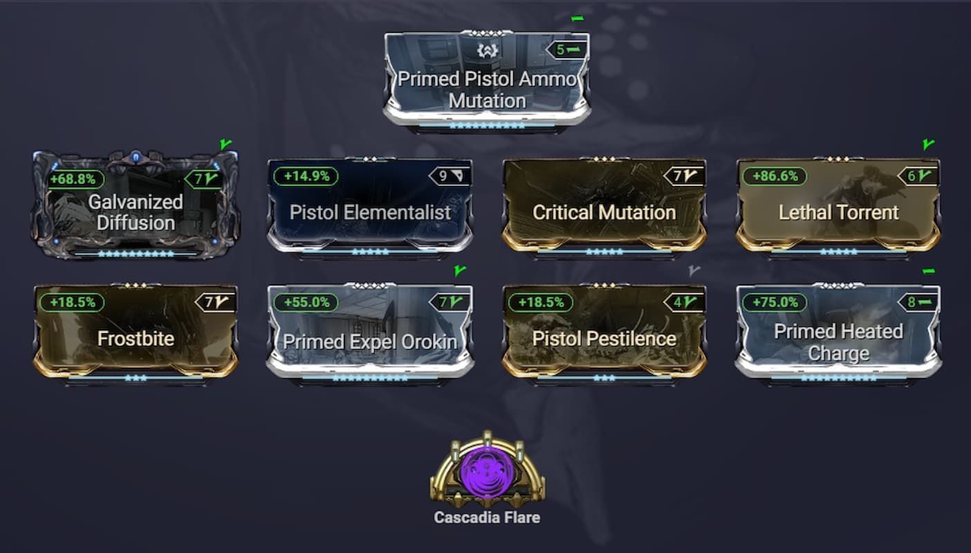 We are going to use Cascadia Flare in our Arcane slot, and as you may surmise from that, we also want to use Heat as the progenitor element. Both builds also make use of the Critical Mutation mod, which gives you a whopping 300% bonus to both crit multiplier and crit chance as long as you keep chaining kills.
