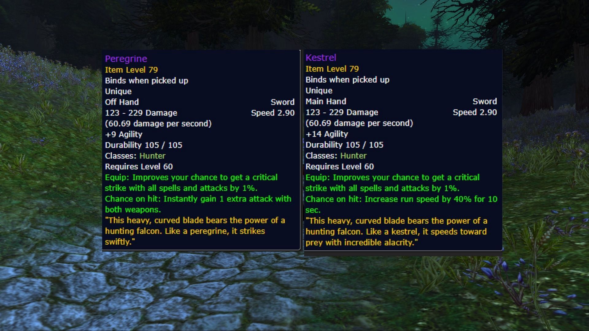 WoW Classic SoD Phase 5’s Hunter-exclusive weapons have been found: Kestrel and Peregrine! These are very powerful blades, with a pair of “chance on hit” abilities. Kestrel gives you a chance to increase your run speed by 40% for 10s, and Peregrine gives you a chance to gain 1 extra attack with both weapons instantly. This makes it a must-collect for any Hunter. Before you do, you need a few things: