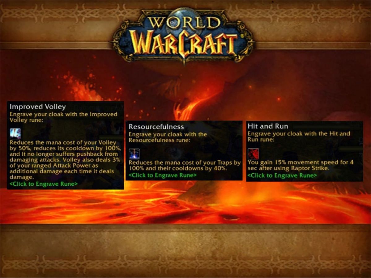 - Improved Volley: Increases the mana cost of your Volley by 50%, reduces its cooldown by 100%, and it no longer suffers pushback from damaging enemies. Volley also deals 3% of your ranged Attack Power as additional damage each time it deals damage.