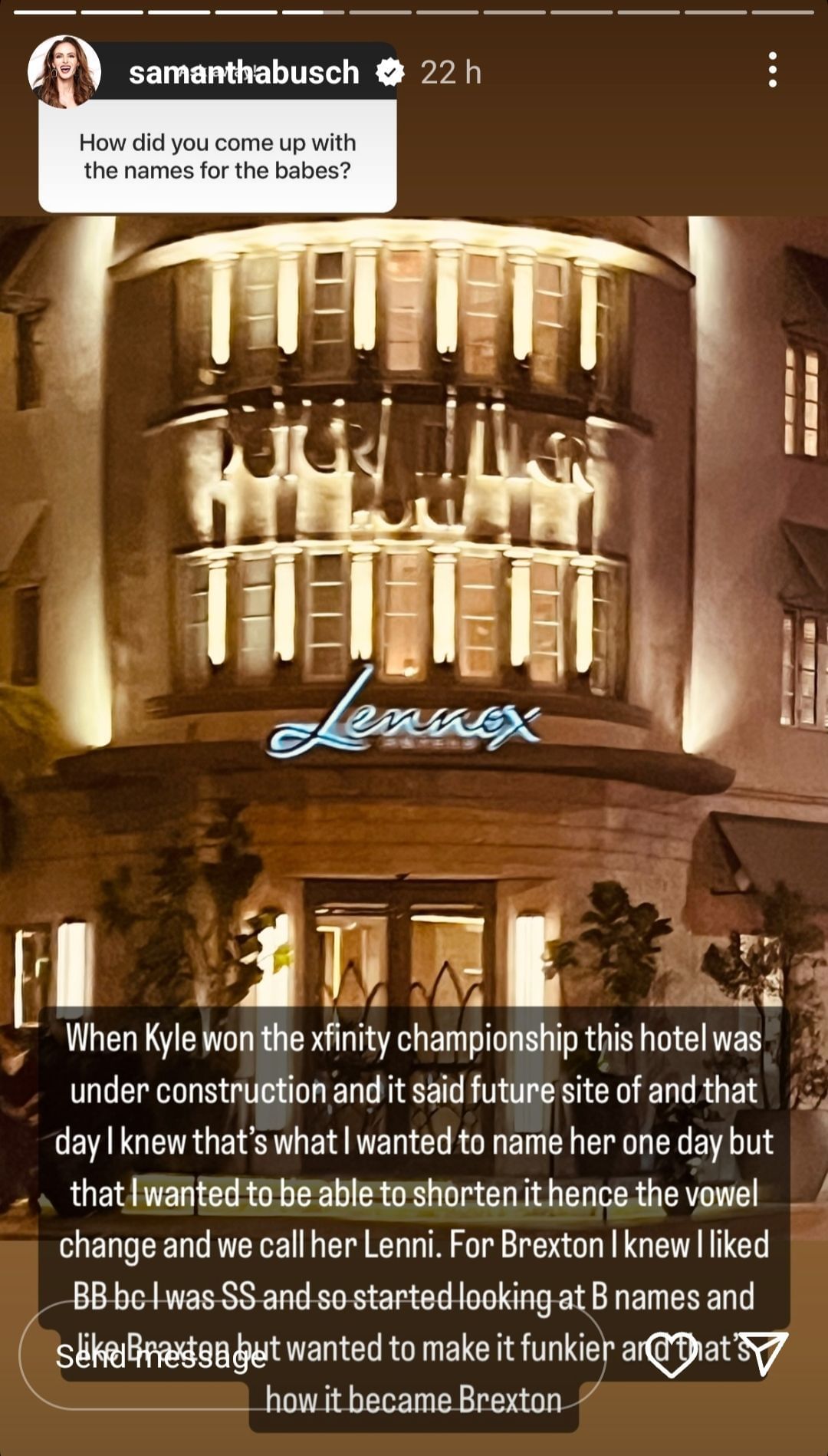 Two-time NASCAR Cup champion Kyle Busch's wife Samantha Busch has shared the story behind the names of their children Brexton and Lennix Busch.