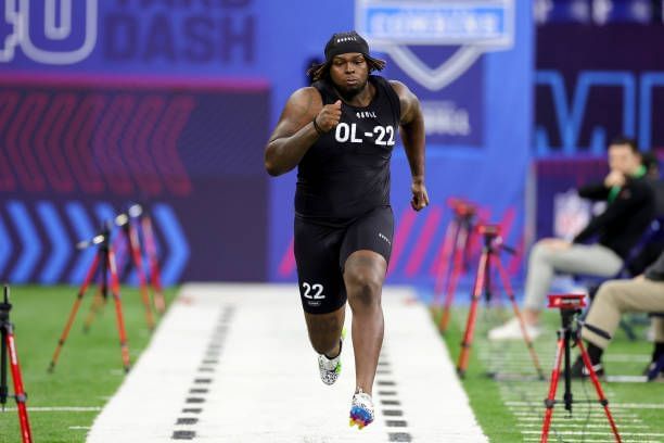Anton Harrison weighs around 310 pounds (140.61 kg). He has a solid build that allows him to hold his ground against defensive players and protect his quarterback.