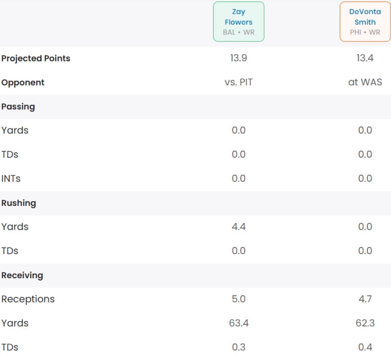 Here's a closer look at Zay Flowers and DeVonta Smith's fantasy football projections for Week 16.