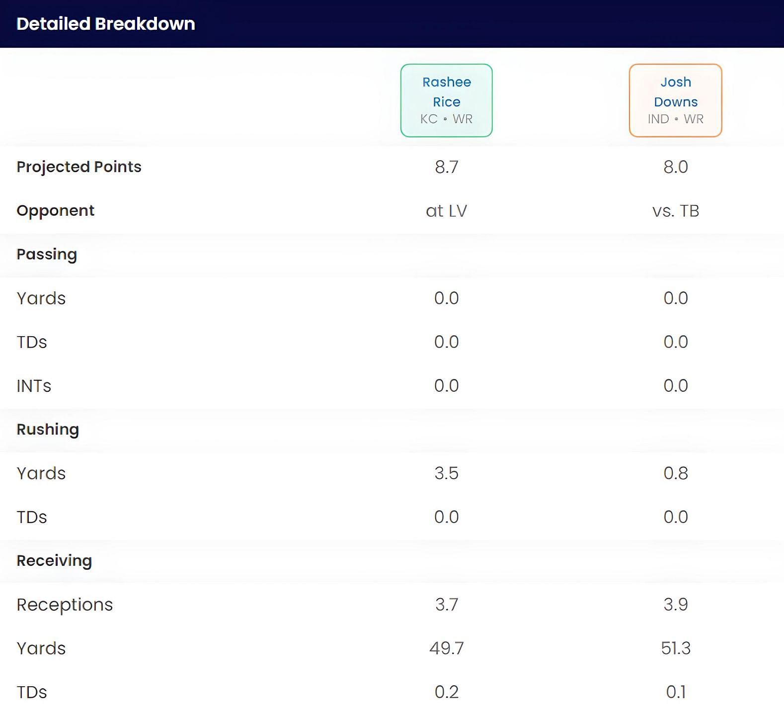 The tool suggests that while there is very little difference between them, neither are expected to put up big points this week. For reference, Rice is projected 10.6 points and Downs 9.90 points in PPR leagues.