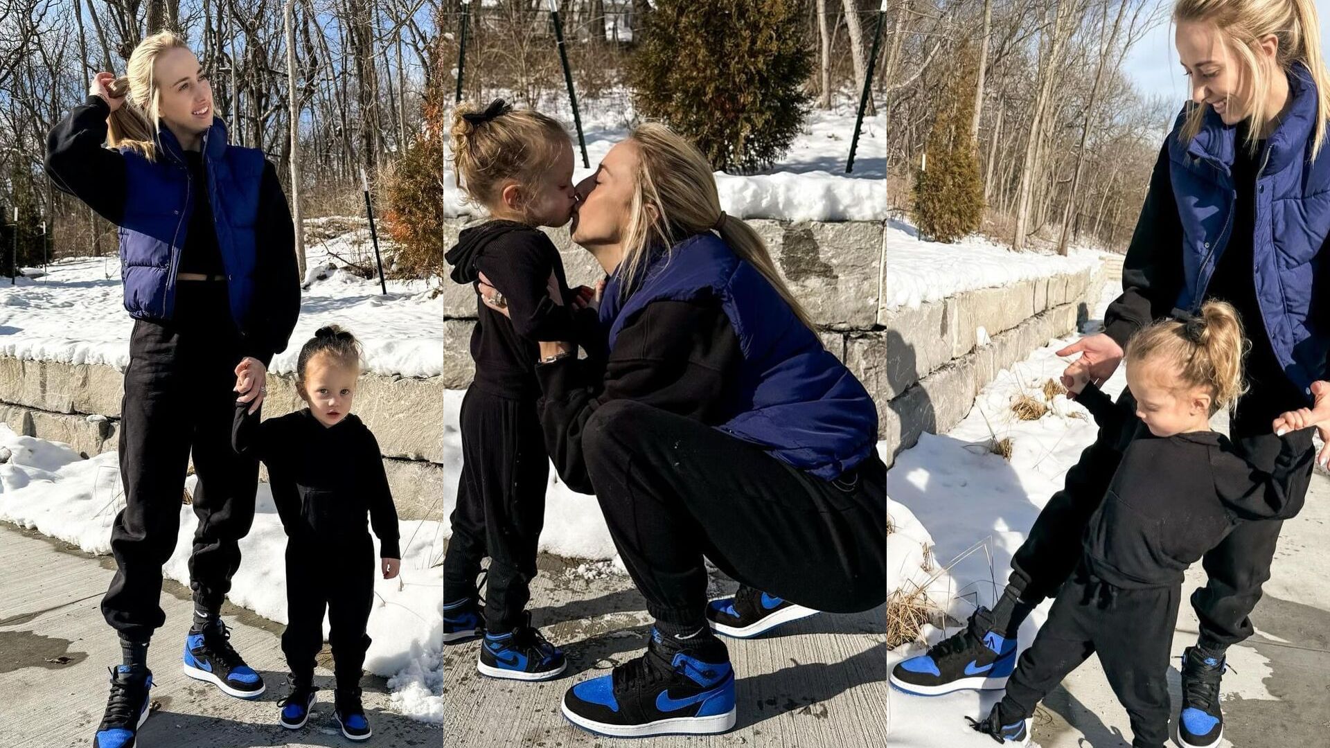 She shared some photos of their activity on Instagram while they bask in the heat brought by the sun during the winter season. They are wearing identical all-black attire and Air Jordans.