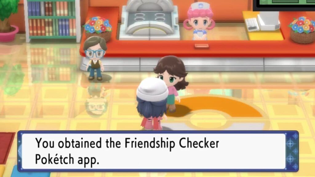 Head to the Eterna City Pokemon Center and speak with the brown-haired NPC standing close to the counter, where you will find Nurse Joy. This NPC will give you the Friendship Checker.
