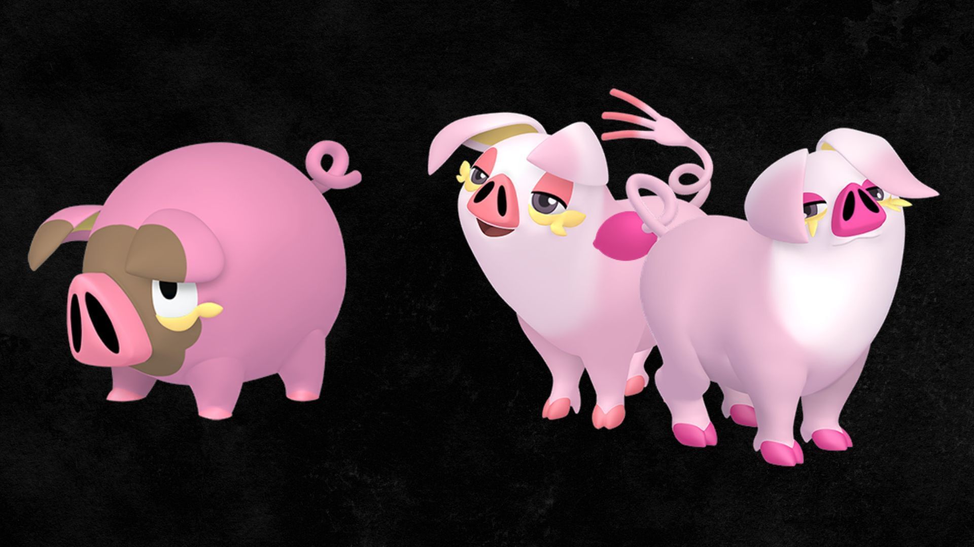 Like most of the creatures in this title, Lechonk comes with a spectacular shiny variant. The dull black theme on the regular version makes way for an attractive pink pig. When you evolve Lechonk into Oinkologne, it keeps the pink theme which looks leagues better than the normal variant.