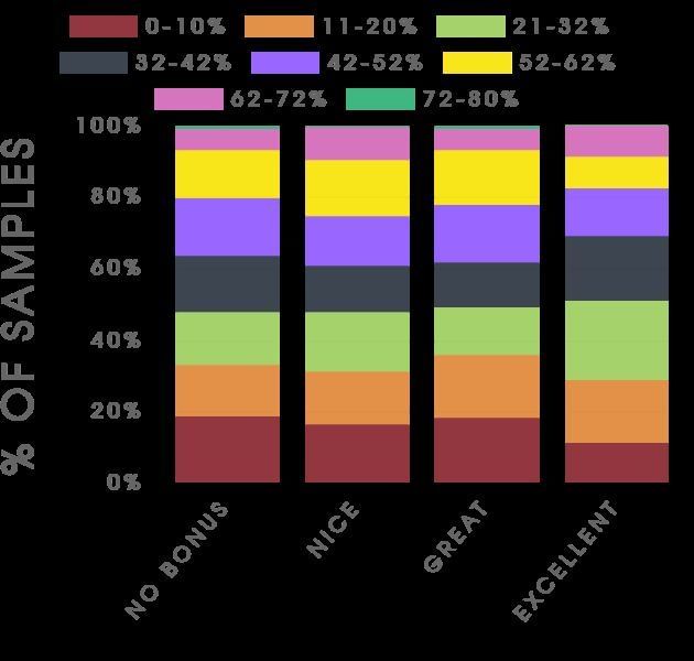 Below are the charted results for straight normal throws. The colors emphasize the percentage of a Pokemon's maximum CP. The left axis represents the percentage of samples that were caught successfully.