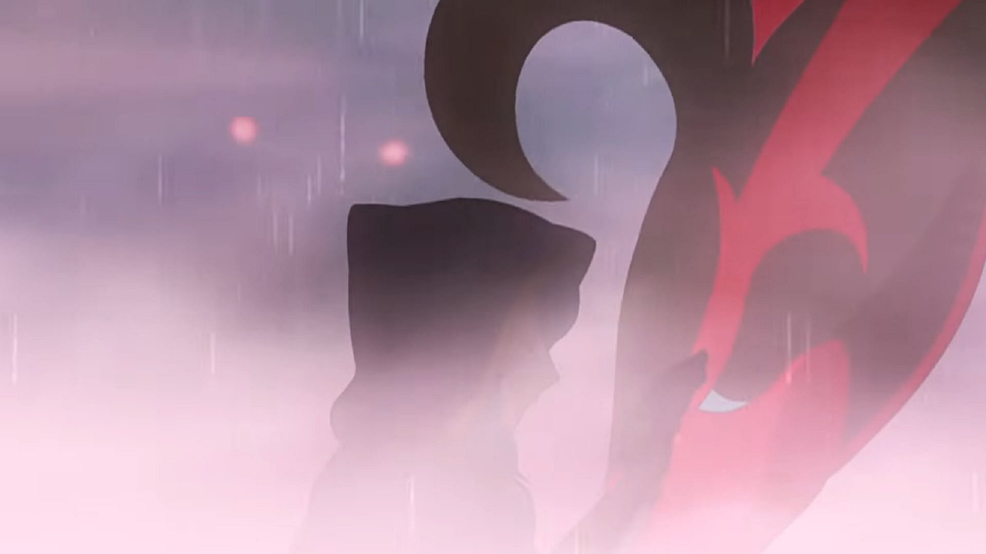 Galarian Moltres and Terapagos talk, and rain begins to fall in the mine, leaving Liko to think that the Legendary Bird is crying. A vision is then created, with the Rising Volt Tacklers witnessing the ancient trainer Lucius talking to Galarian Moltres in the past and uttering the name "Rakua."