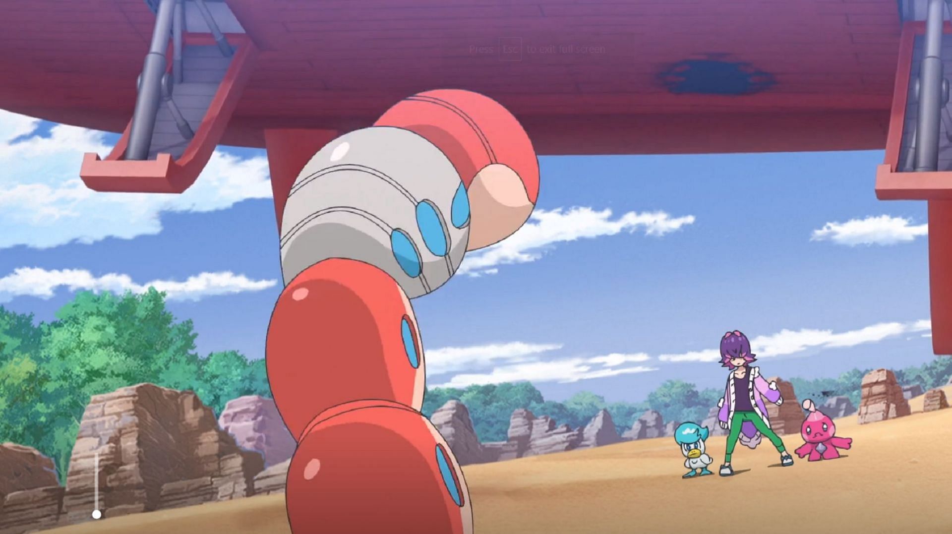 The Orthworm launches itself at the Pokemon Horizons heroes, catching Tinkatink's hammer in its mouth and causing it to cry. Dot tells Tinkatink that she'll get the hammer back, and she hops out of the Brave Olivine and confronts the Orthworm alongside Quaxly and Tinkatink, realizing that the Orthworm also cut the anchor to the Brave Olivine and is causing it to drift away.