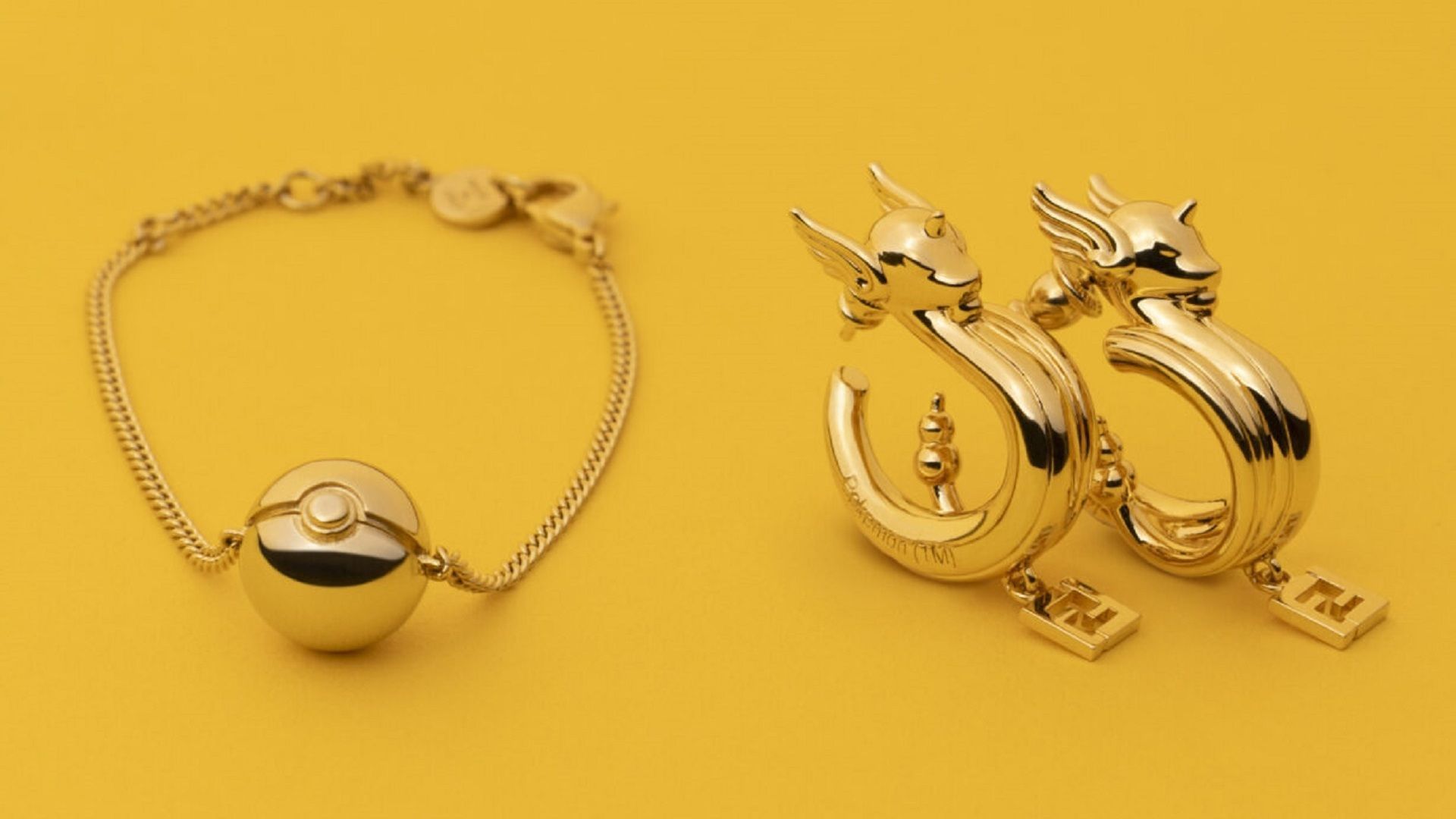 - Brass jewelry, including earrings, rings, necklaces, and soft chain bracelets depicting Dratini, Dragonair, and a Poke Ball. Some Poke Ball necklaces shared by Fendi can also be opened to display the FF logo inside.
