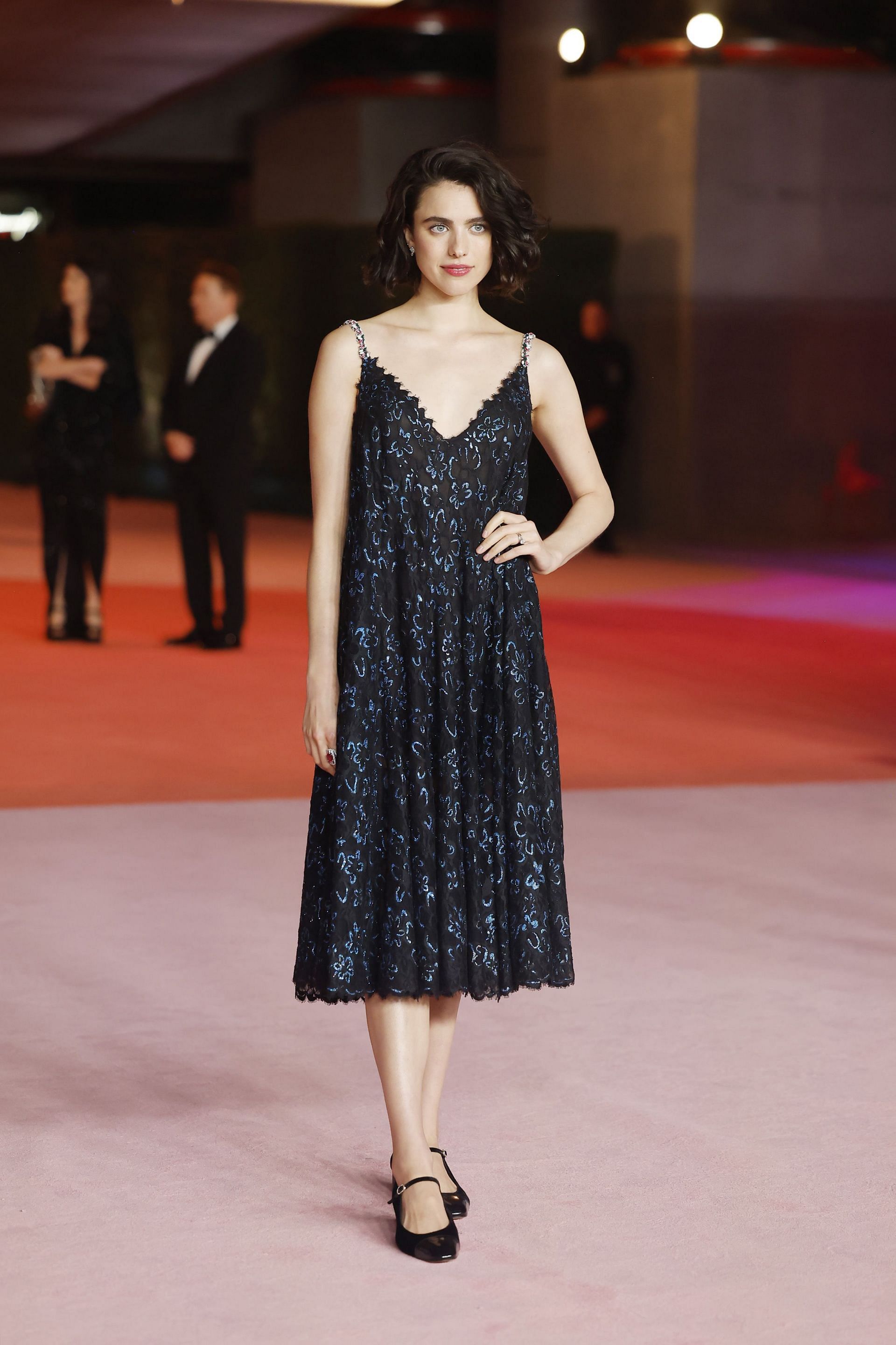 Margaret Qualley channeled a classic look in Chanel's knee-length gown, keeping a minimalistic appeal. With her bob-cut messy hair, Margaret exuded glamour in this loose-fit dress. She finished off the look with a black Mary Jane flat.