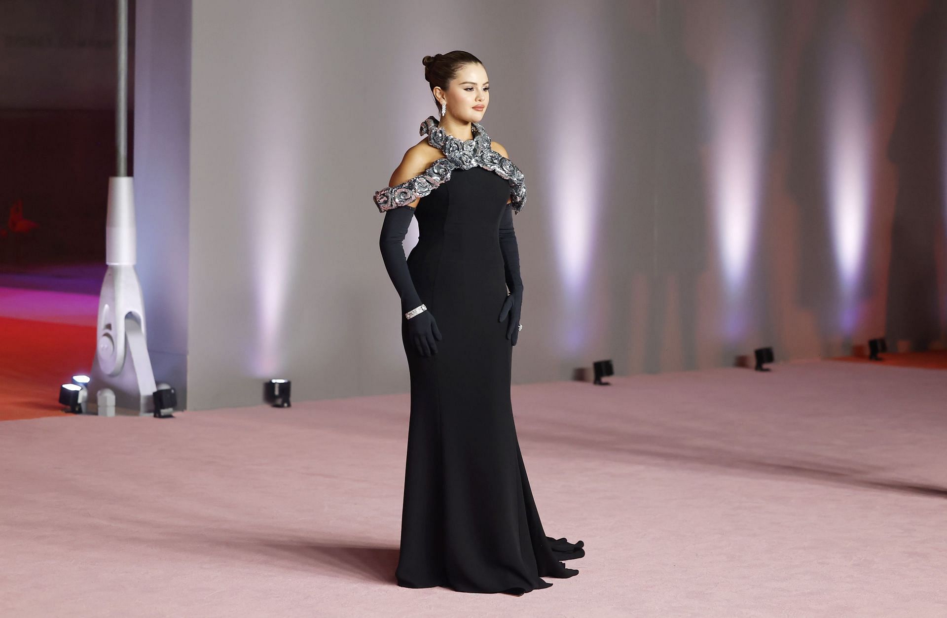 Selena added a pair of opera gloves to continue the drama. The diamond bracelet and the cluster ring augmented the red carpet look, further.