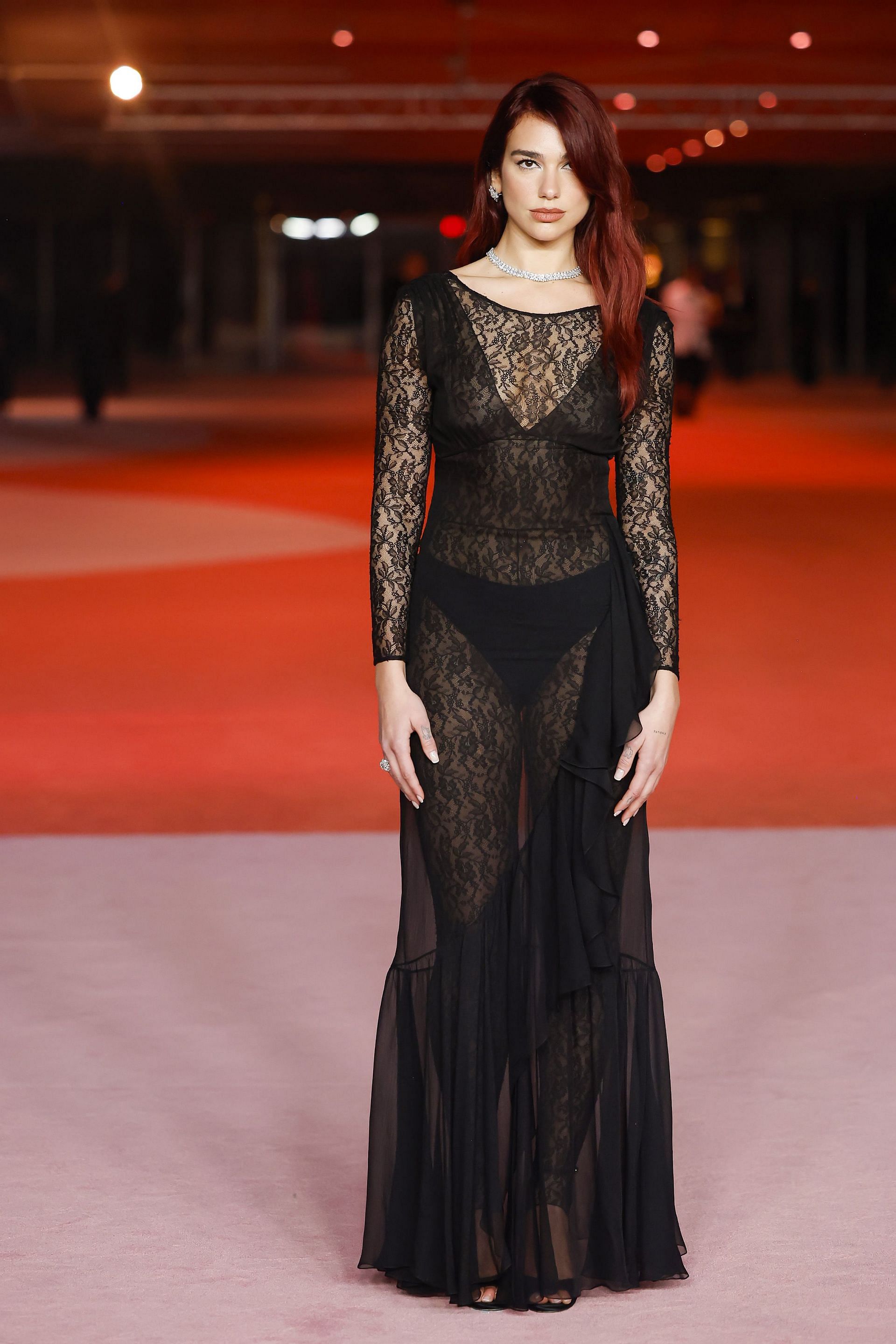 Dua carried the sheer and lacy silhouette boldly. To elevate the glam look, she attached Tiffany's diamond necklace and earrings, finished off with an open-toed shoe.
