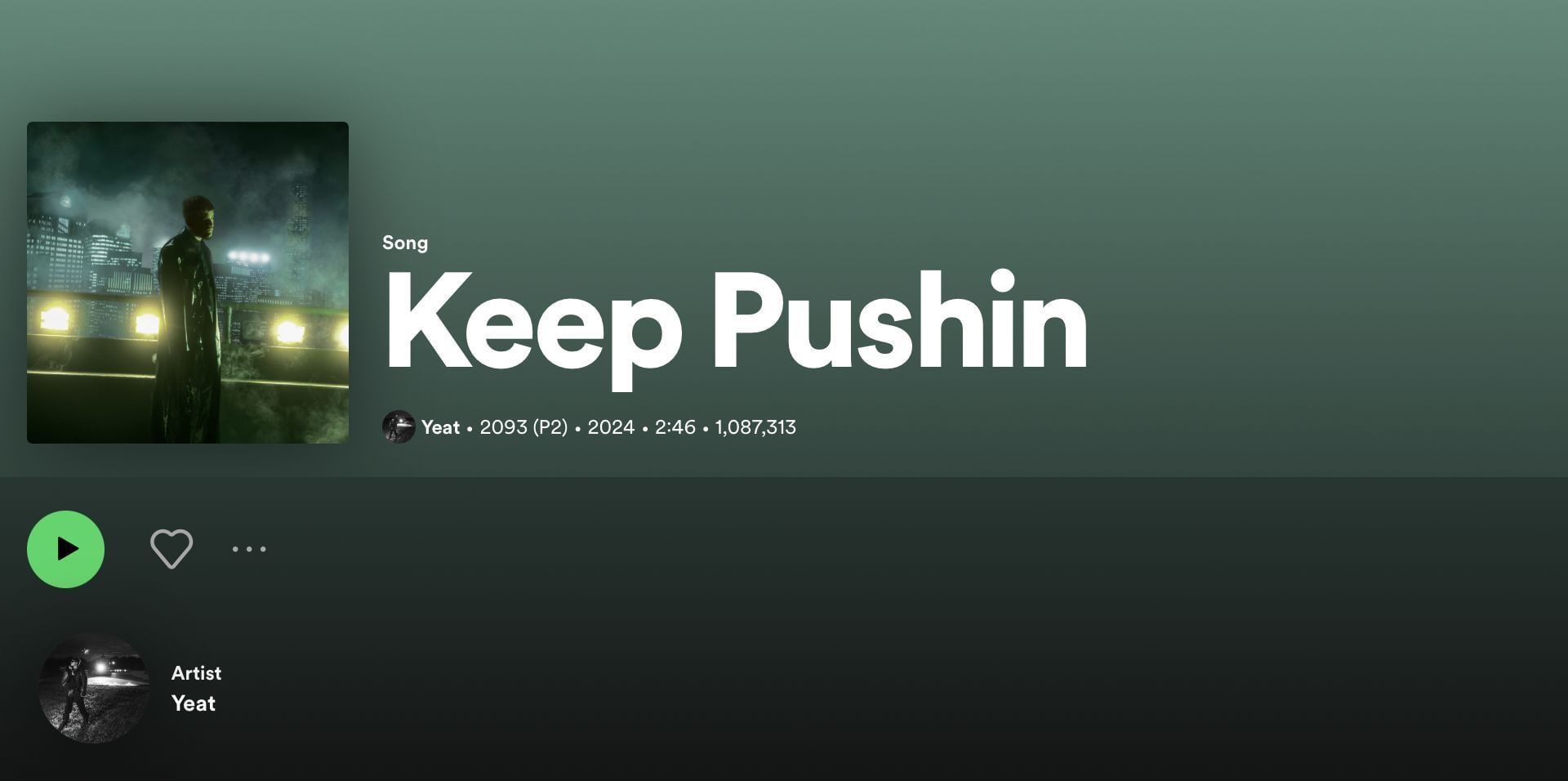 Keep Pushin is a track where Yeat explains his defiant worldviews. He states how regardless of the paths one chooses in life, there will always be people who will try to put you down. His ideaology is that one must "keep pushing," in order to survive.